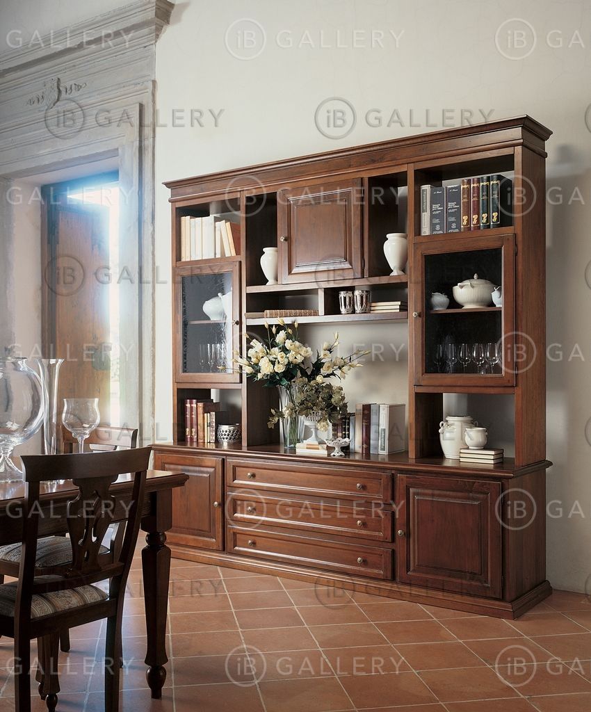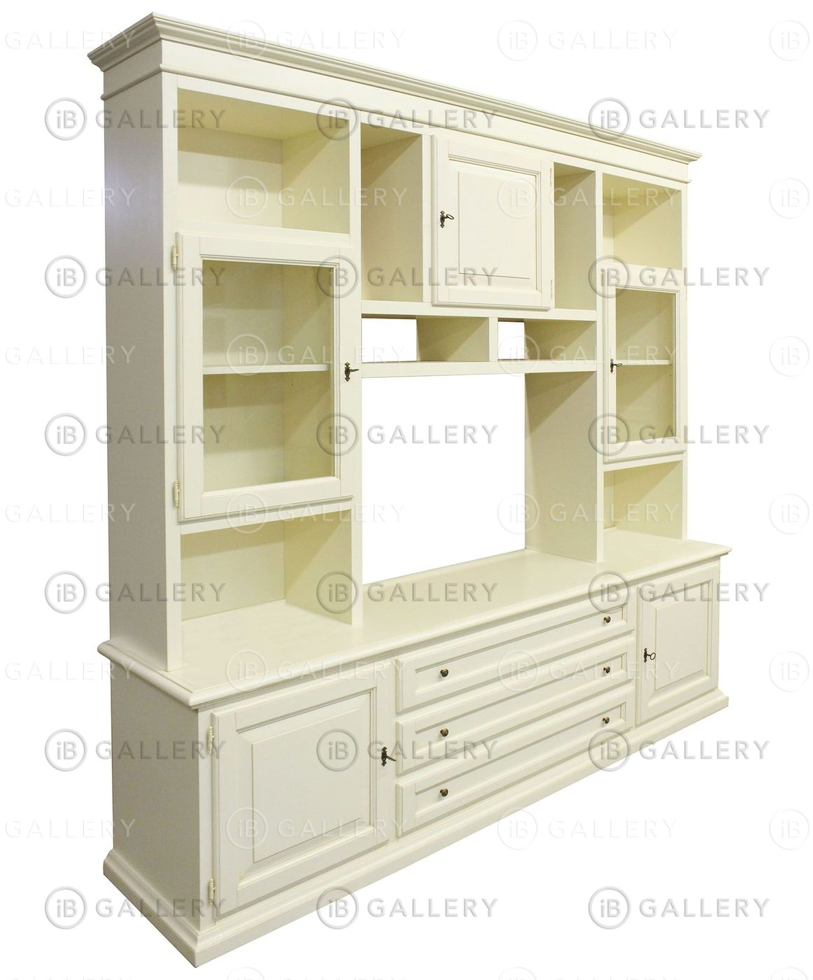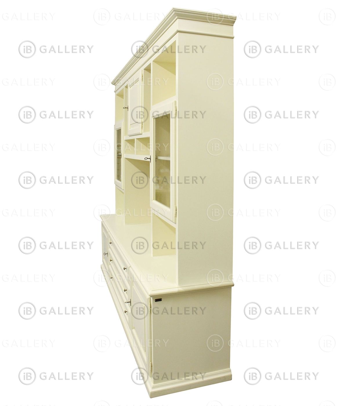 Оснащена открытыми полками, стеклянными и деревянными дверцами и тремя выдвижными ящиками.