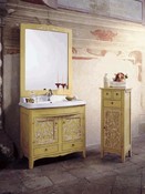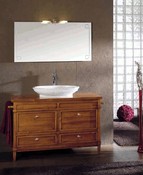 Состоит из шкафа со встроенной стеклянной раковиной, большого зеркала с рамой, отделанной под металл, два бра.