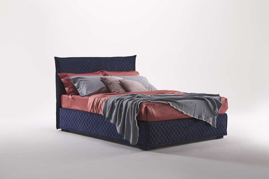 Удобная кровать в современном дизайне с толстым стеганым одеялом на основании и изголовье.