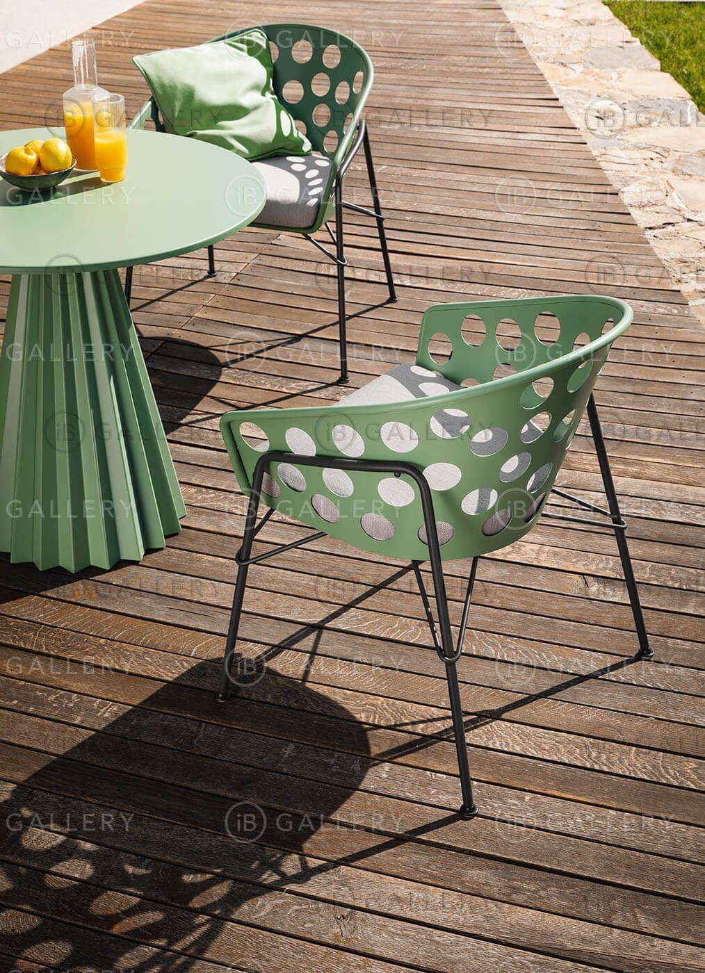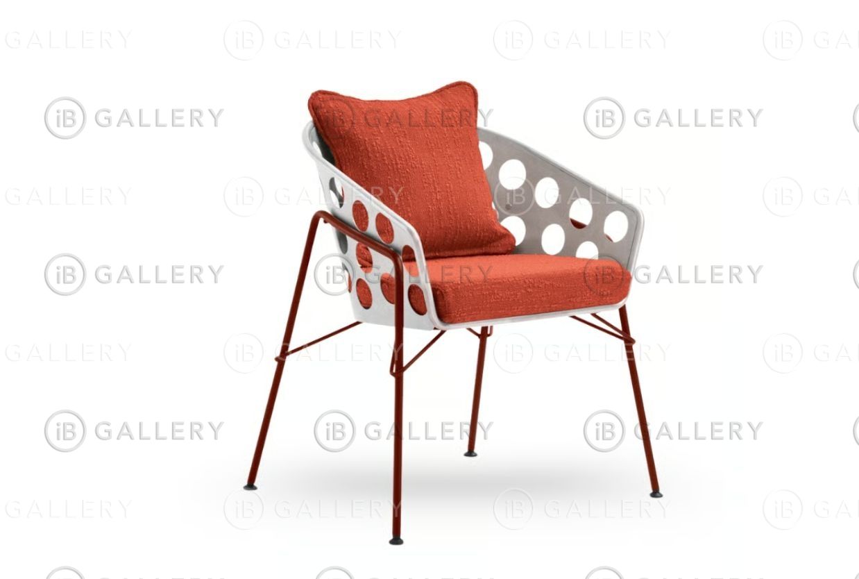 Стул с основанием на четырех ножках, конструкцией и спинкой из лакированного металла. Подушки, обитые тканью, кожей или искусственной кожей. Кресло можно сконфигурировать, выбрав различные цвета ножек и корпуса. Bolle также доступен в наружном исполнении.