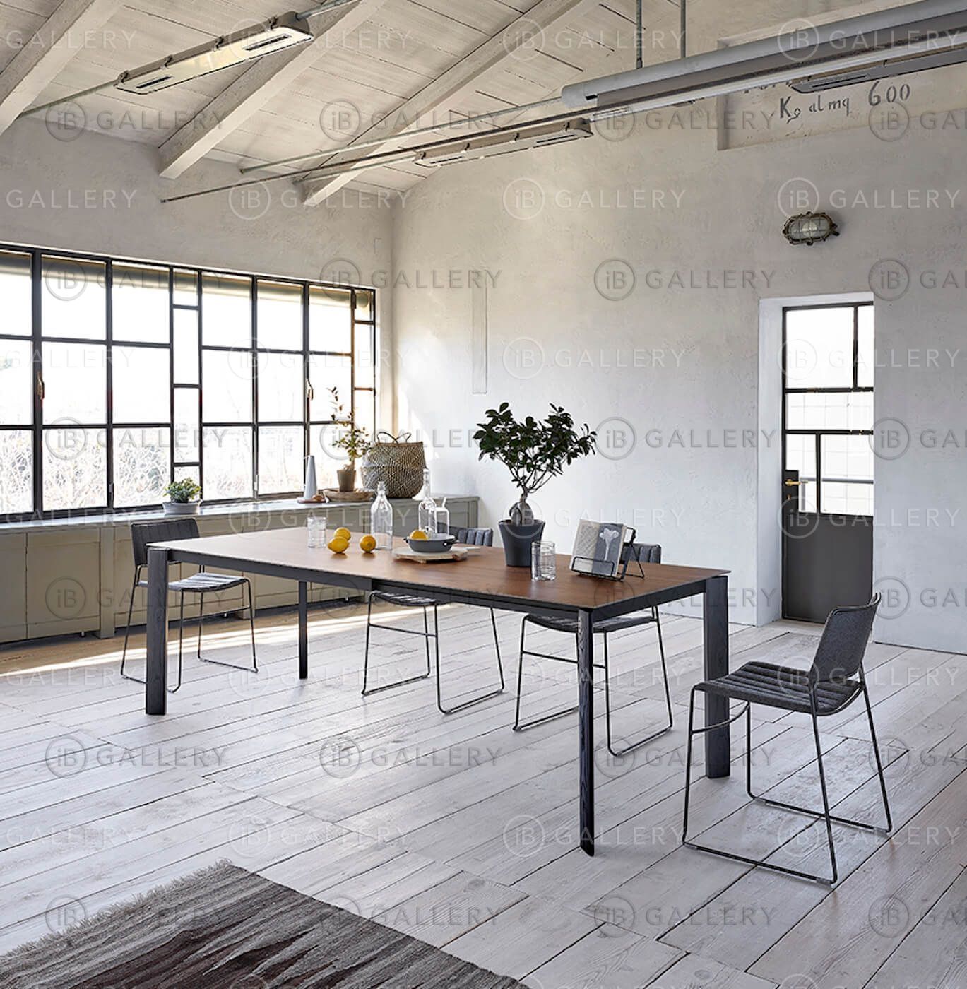 Выдвижной стол с лакированным металлическим каркасом и ножками, покрытыми массивом дерева.
