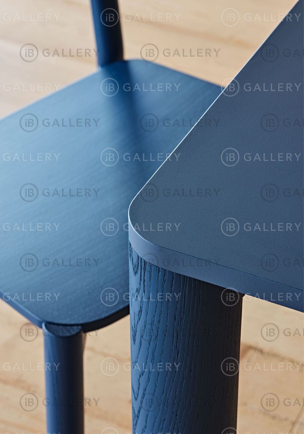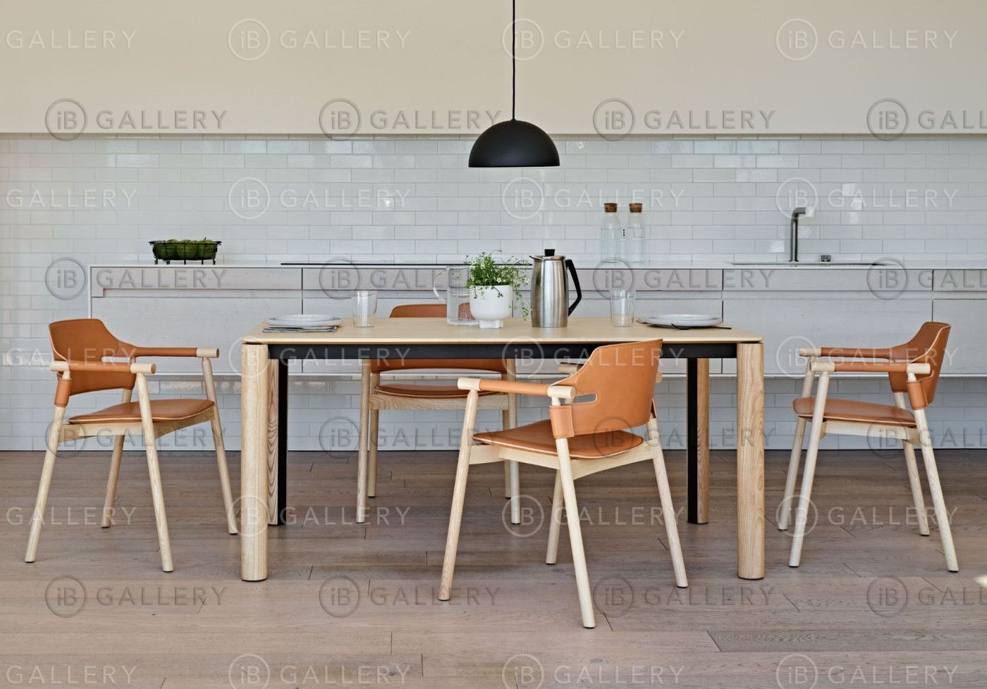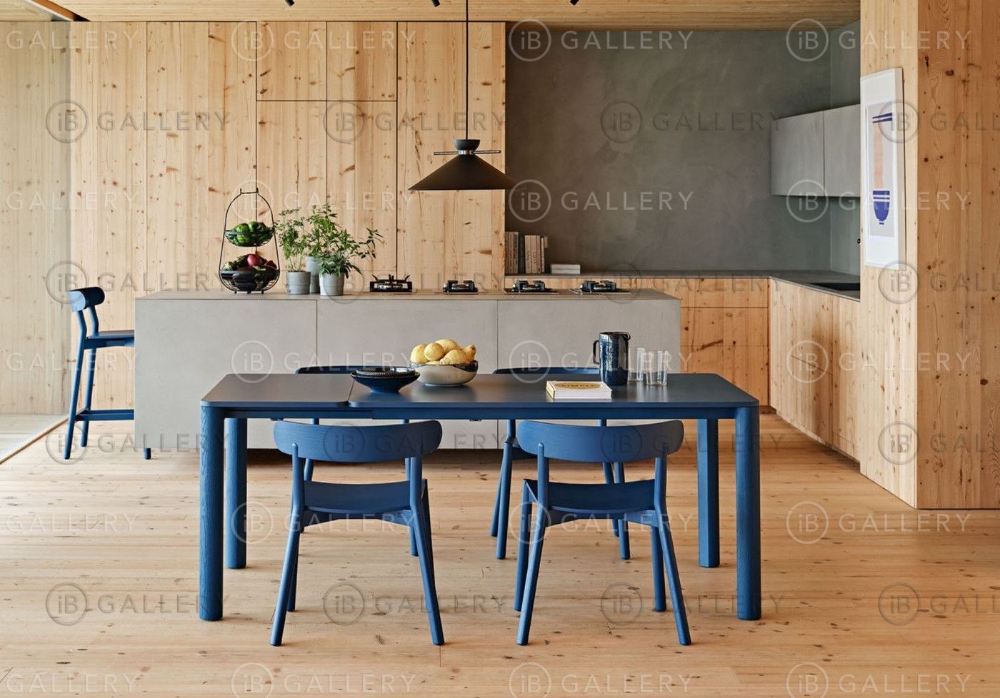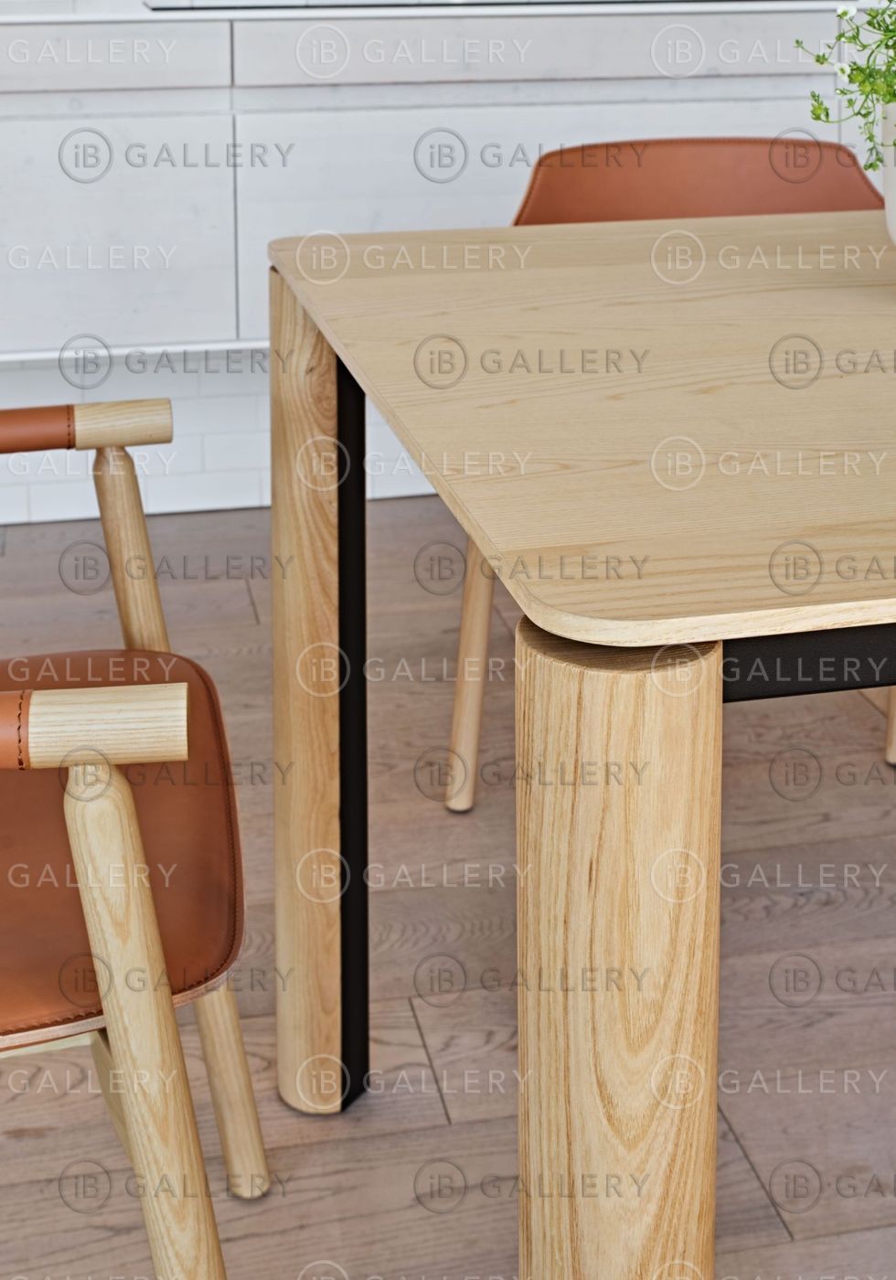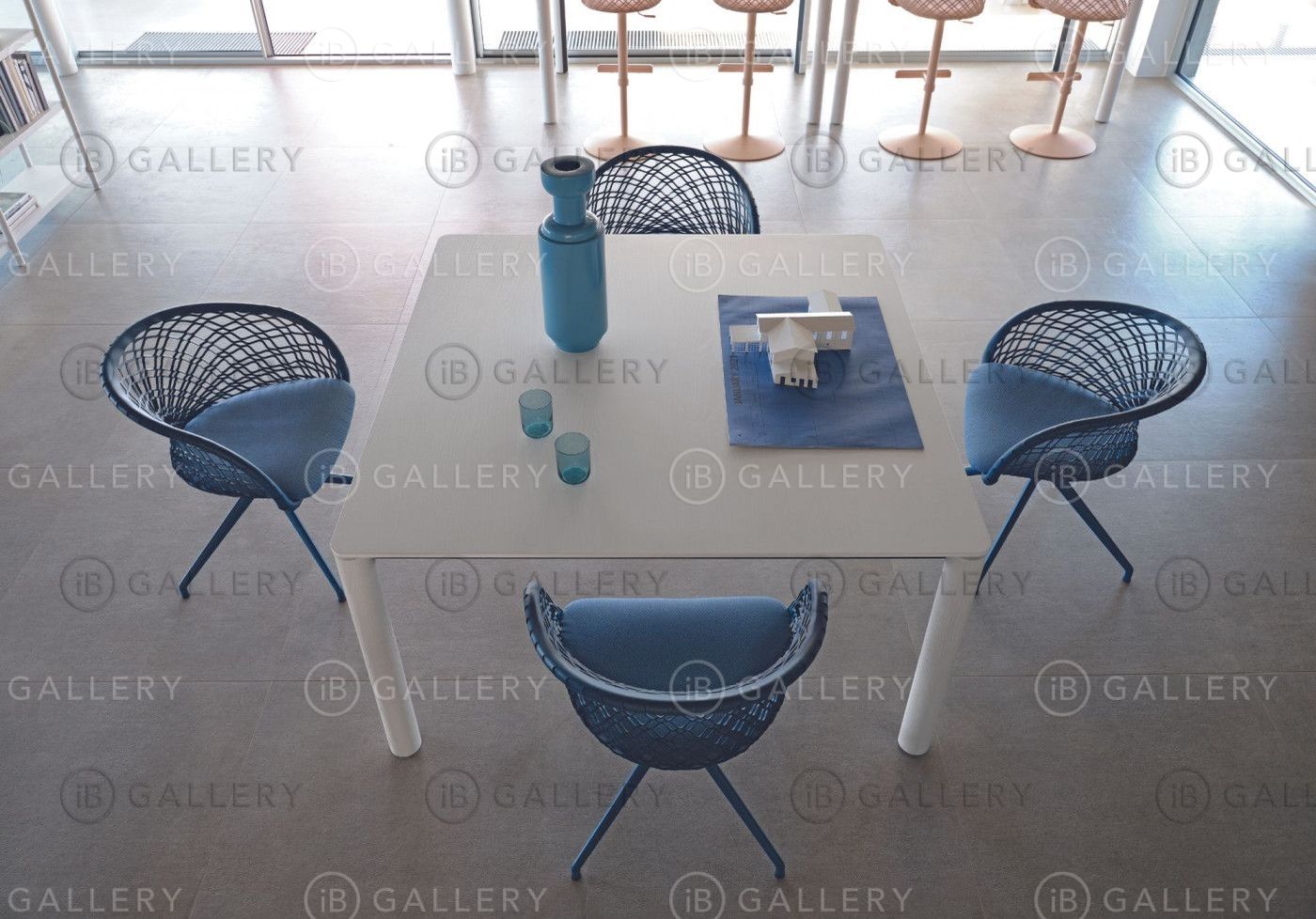 Деревянный стол с четырехногим основанием из окрашенного ясеня с лакированной металлической сердцевиной. Металлическая конструкция. Столешница из шпонированного дерева, феникса, ламината, хрустальной керамики или стекла.