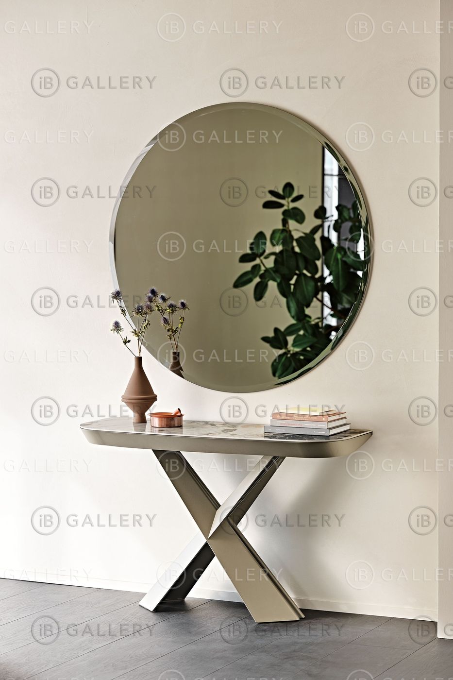 Выдвижная консоль с основанием из окрашенной стали с тиснением титана (GFM11), бронзы (GFM18) или жемчуга (GFM70). Столешница из керамического мрамора в матовых цветах. Удлинители из ламината в цвет основания. В комплекте сумка для удлинителей.