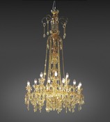 Люстра из янтарного резного хрусталя, металла с золотисто-никелевой отделкой и черными тканевыми абажурами. Выпускается в различных размерах и цветах.