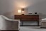 Настольная лампа из хрусталя с отделкой из хромированного металла и тканевым абажуром розового или бордового цвета.