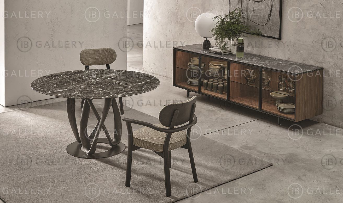 Металлическое основание с серой оловянной отделкой, рама из ореха Каналетто и столешница из дерева или мрамора.