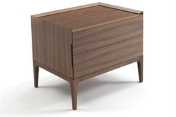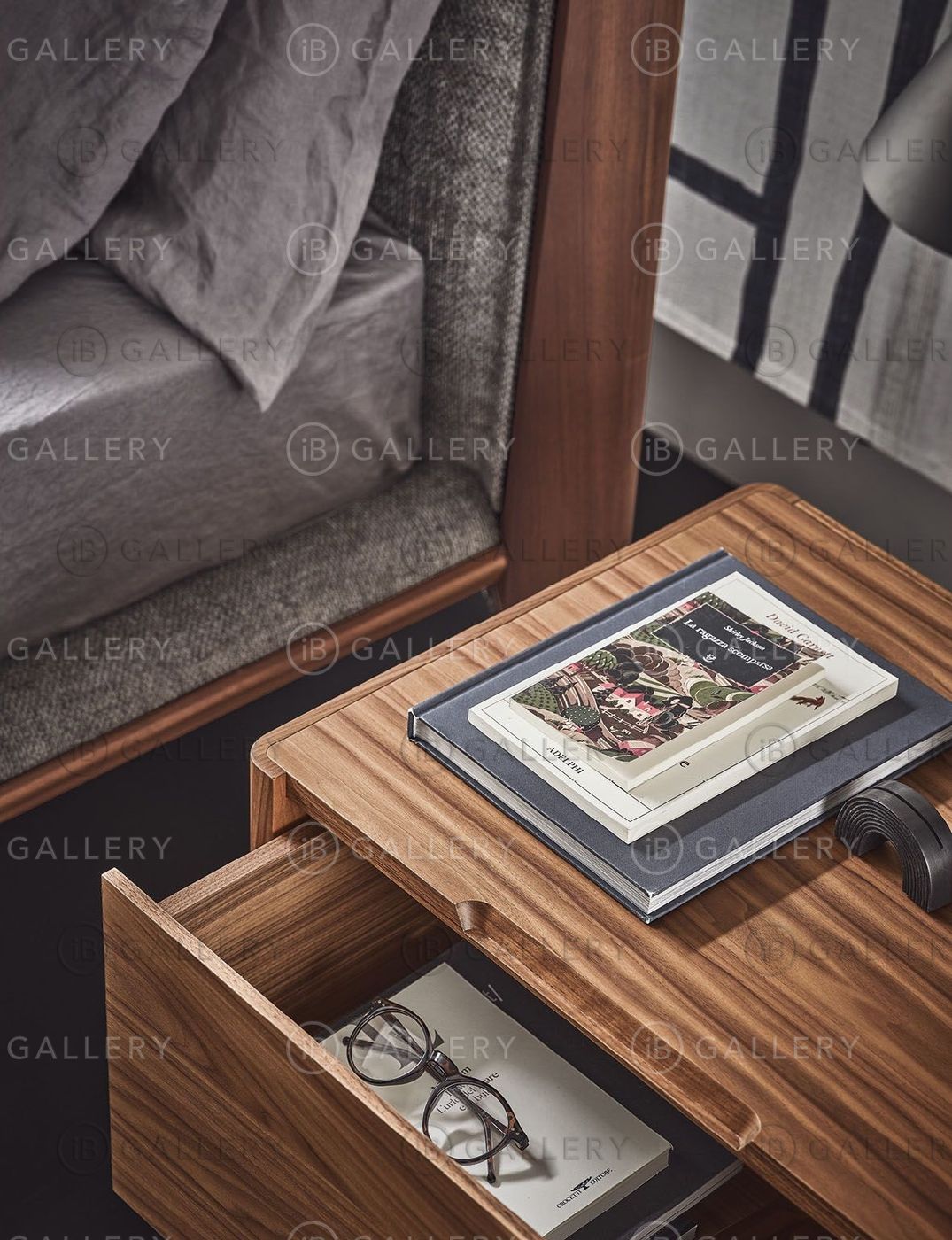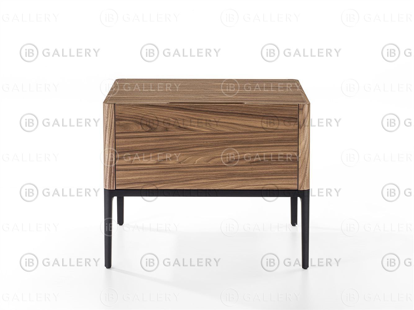 Ночной столик из ореха Каналетто с основанием из матового черного металла, изготовленного методом литья под давлением по индивидуальному заказу компании.