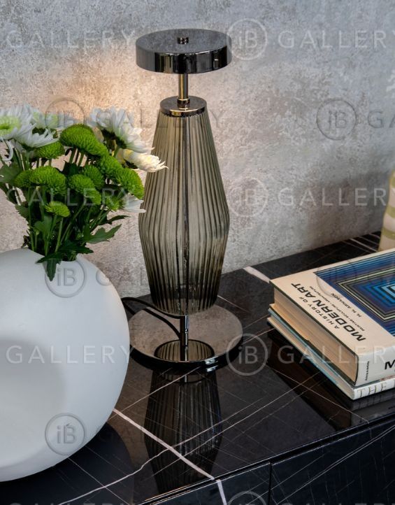 Элегантные светильники, выполненные в форме прозрачных кристаллов с изящной геометрией и деталями из черного хрома: свет отражается от ребристой поверхности стекла янтарных и дымчатых оттенков, создавая теплую атмосферу.