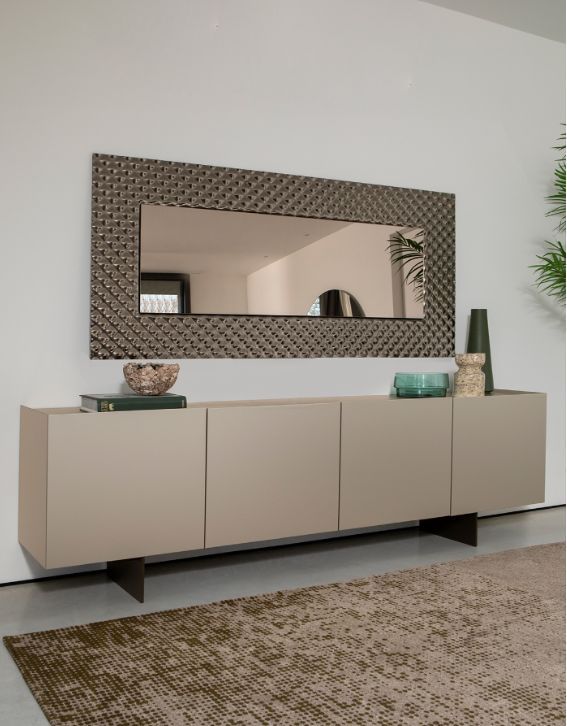 Сервант с четырьмя дверцами из лакированного дерева в цвете шампань с окрашенными металлическими ножками. Его линейный и современный дизайн делает его подходящим для любого интерьера.