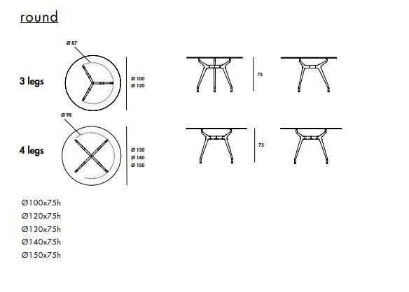 Базовая модель Arkos round - круглый стол, доступный в нескольких размерах. Модель Arkos XXL - столы ещё большего размера с возможностью установки механизма Lazy Susan. Столы Arkos shaped - серия квадратных и прямоугольных столов со скруглёнными краями.