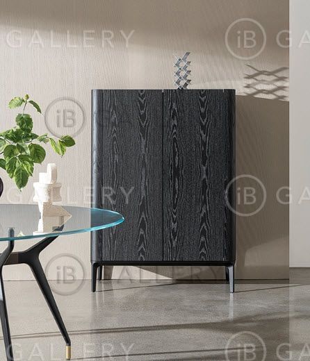 Сервант с алюминиевой конструкцией и ножками в различных вариантах отделки. Элементы из МДФ, шпонированного орехом Каналетто или дубом, окрашенным в цвет венге. Столешница из различных материалов. Внутренняя полка из дымчатого стекла с регулируемой высотой.