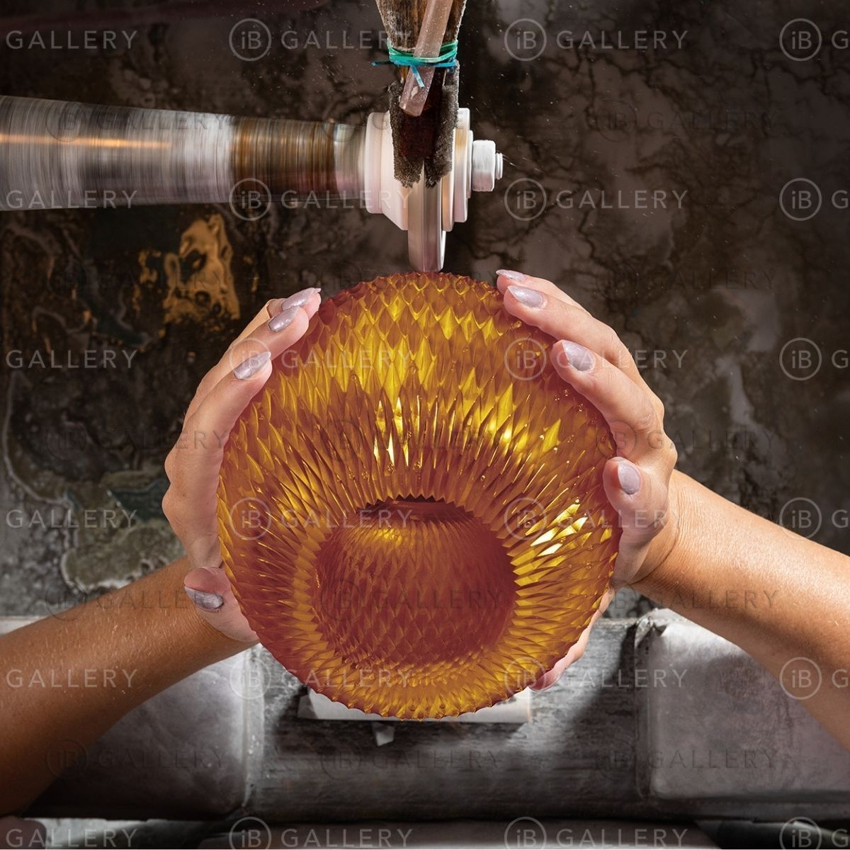 Талантливые мастера-резчики на стекольном заводе в Нижборе способны перенести технически сложные узоры Рони Плесла на вазы и подсвечники из коллекции Metamorphosis. Хотя дизайн кажется совершенно правильным, на самом деле вы можете заметить незначительные вариации, свидетельствующие об исключительно сложной ручной работе. Резчик работает над одной вазой большую часть дня и должен избегать даже одного неосторожного движения.