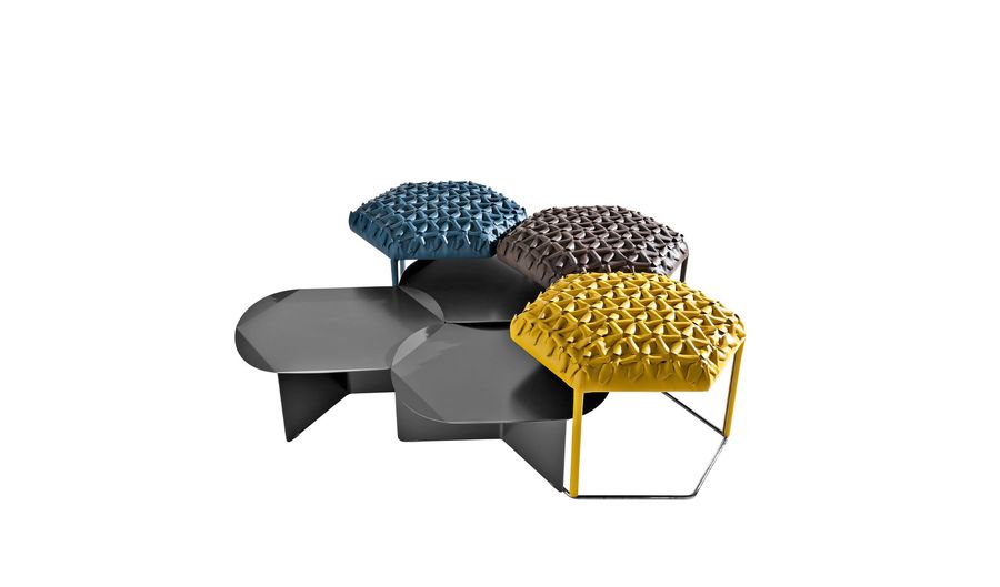 Изящно-поэтичный Hive представляет собой оригинальное сочетание пуфиков и маленьких столиков. Первые имеют трехмерную поверхность, полученную в результате сборки маленьких кожаных лепестков, выброшенных из производственного процесса. Последние, напротив, получаются из сложенного металлического листа.