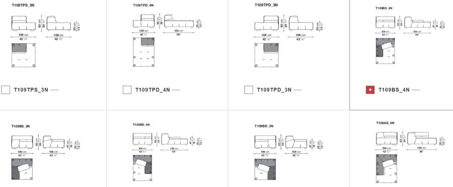 Вся линейка отличается исключительной модульностью и абсолютной композиционной свободой. Систему составляют многочисленные элементы, начиная с пуфика в качестве базовой детали, который затем дополняется центральными, угловыми и концевыми элементами с низким или высоким подлокотником. Эти элементы используются для создания традиционных диванов, диванов с шезлонгом, угловых диванов и островных элементов, которые обеспечивают возможность сидения на 360°.