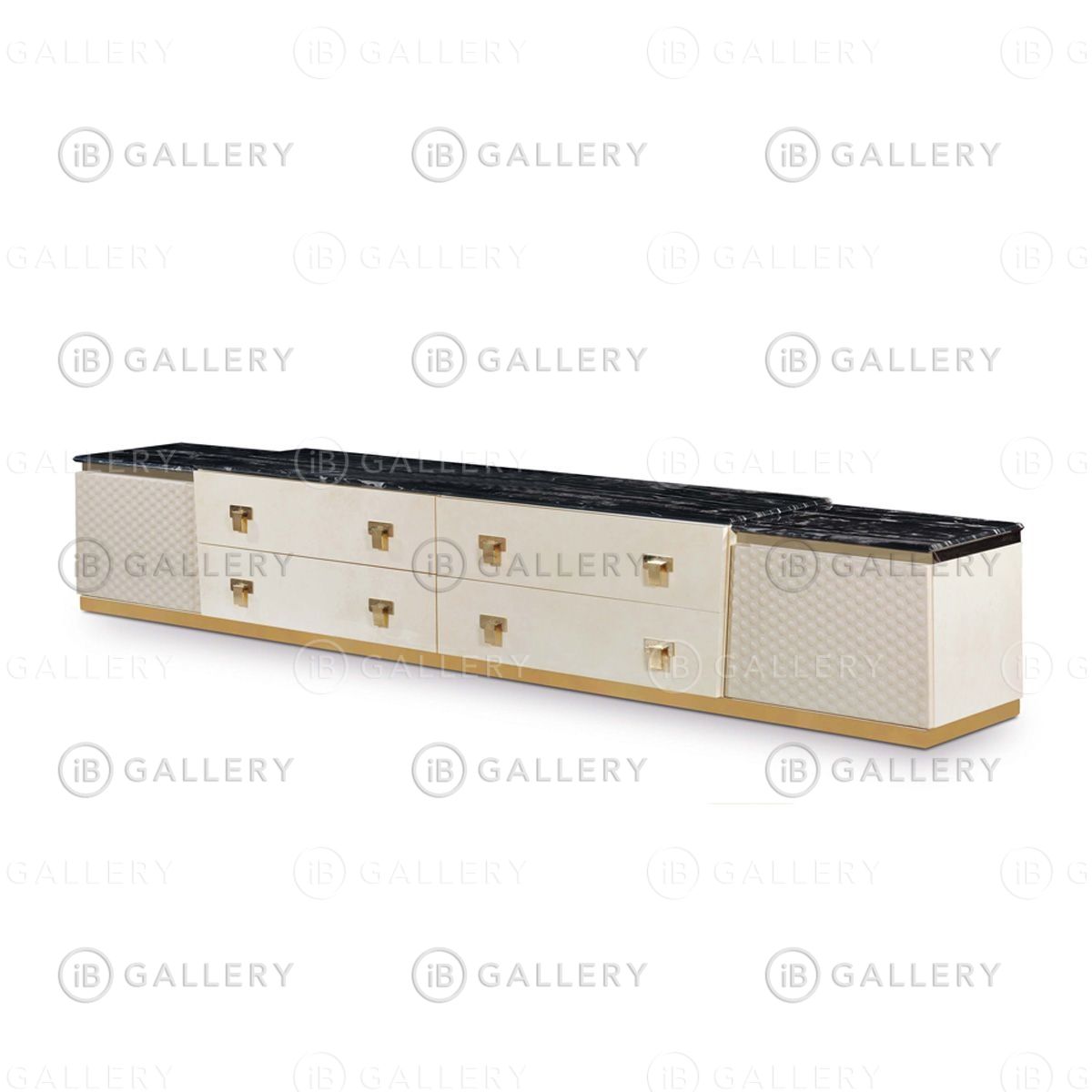 Тумба для ТВ коллекции Vogue повторяет стилистический код всех систем хранения коллекции Vogue, деревянная структура с отделкой глянцевым лаком украшена металлическими деталями цвета золота. Столешница может быть мраморной или деревянной.