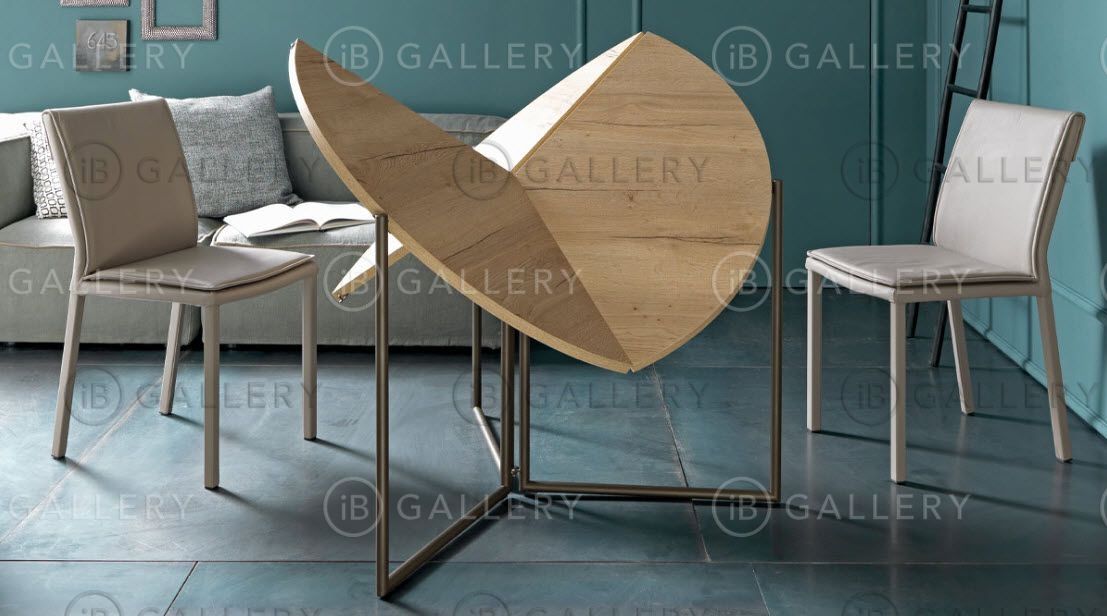 Складной стол с открывающейся по компасу конструкцией, металлическим каркасом и откидной столешницей из меламина.