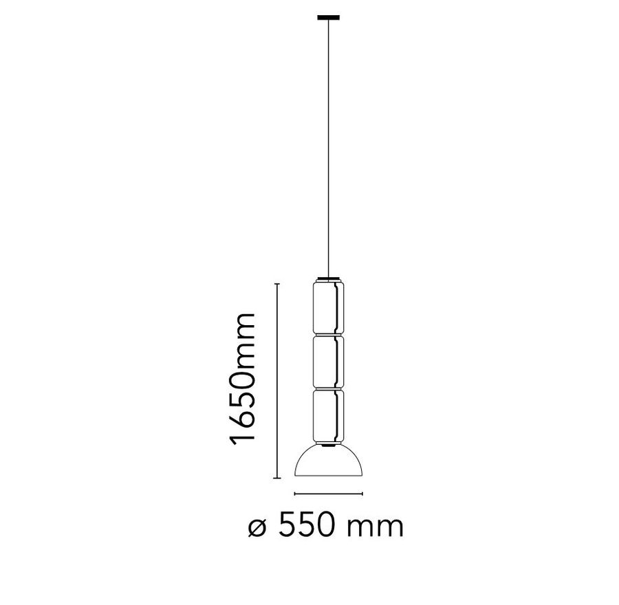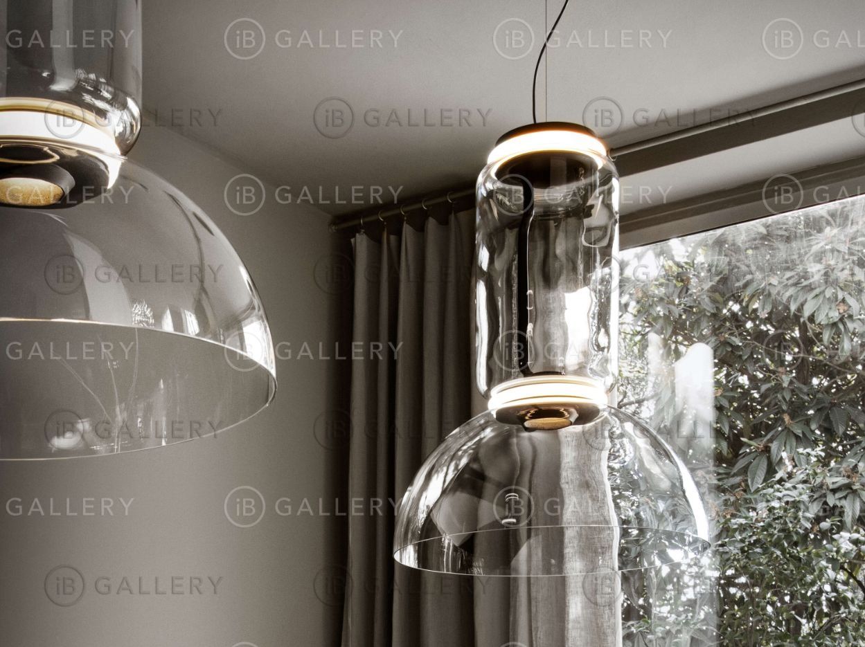 Подвесные светильники, состоящие из соединяющихся стеклянных модулей длиной 3,2 м (126,77 дюйма) с подвесным силовым кабелем длиной 4 м (157,48 дюйма). Цилиндрическая и полусферическая конструкция из прозрачного выдувного стекла, подвесной кольцевой соединитель из литого под давлением алюминия, внутренний боковой кронштейн из гидроформованной стали и наружные кольцевые диффузоры из оптического опалового силикона, отлитые под давлением.