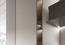 Шкаф со дверцами, покрытыми матовым лаком, со встроенной точечной ручкой и открытыми блоками со стеклянными полками с подсветкой сзади.