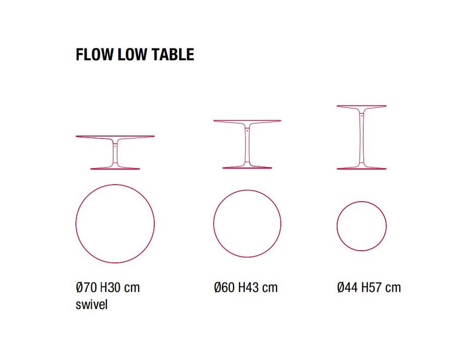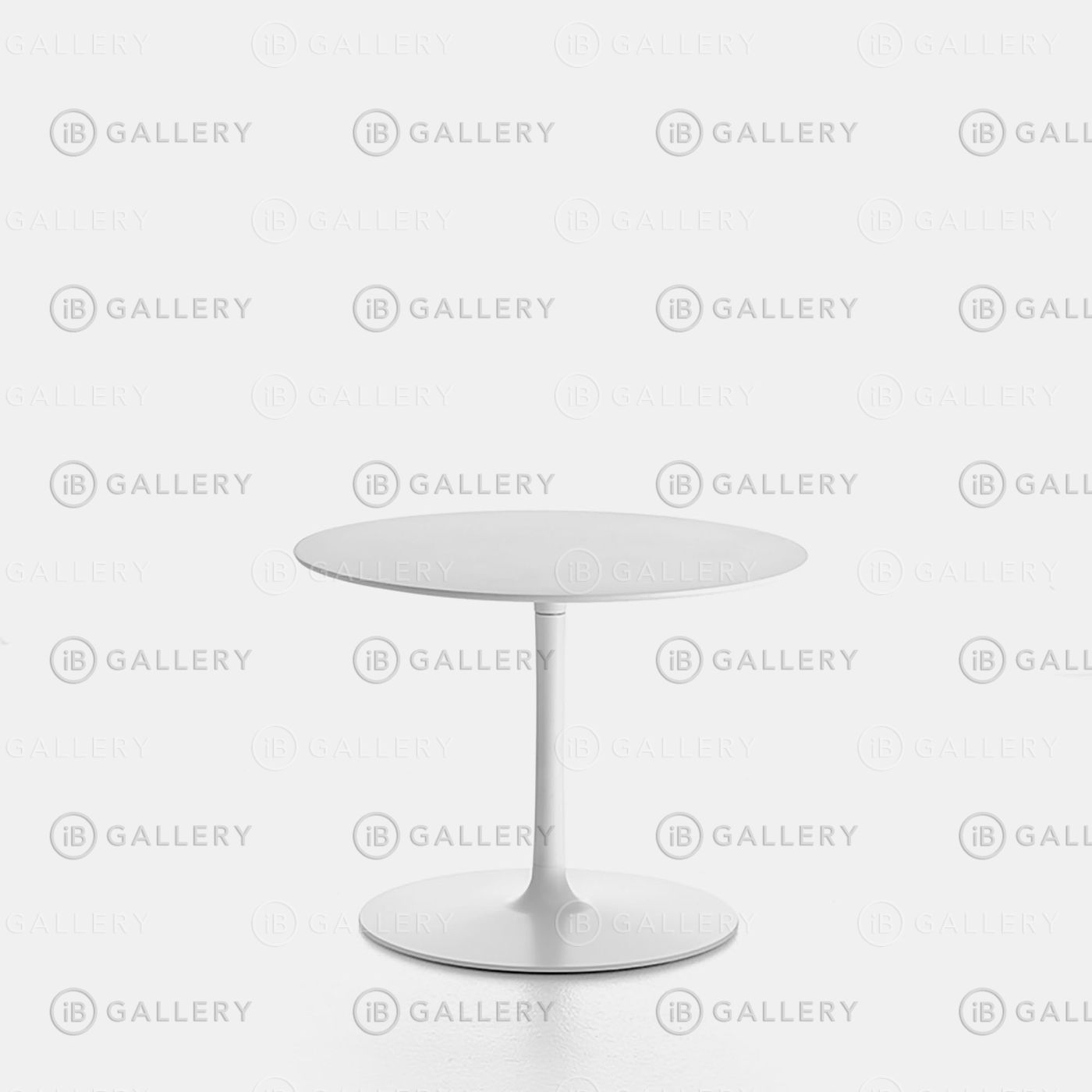 Круглые журнальные столики трех цветов. Основание с центральной ножкой из алюминия, покрытого матово-белым или глянцево-черным лаком.