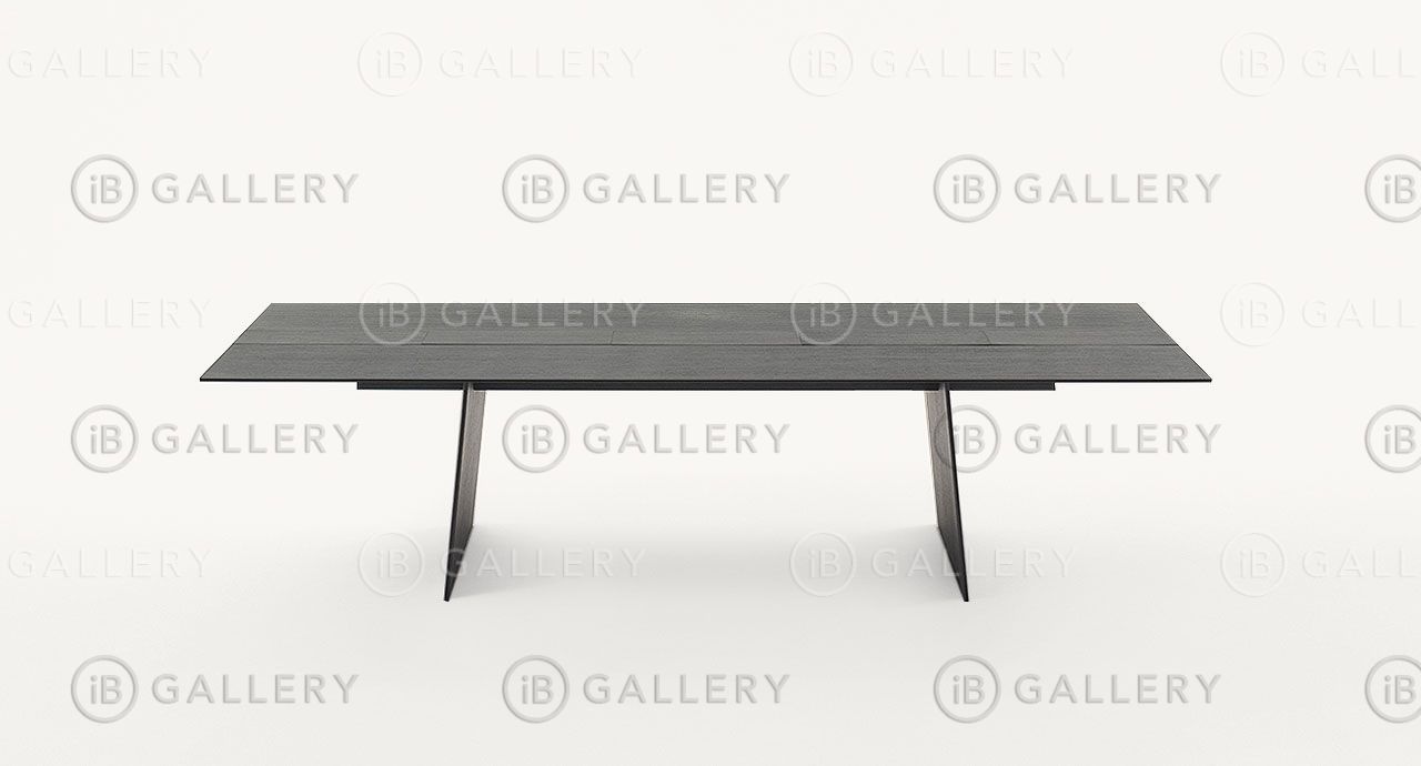 Обеденный стол доступен в двух различных размерах. Столешница имеет центральную секцию, разделенную на независимые и съемные элементы. Необходимое количество таких элементов можно заменить разделочной доской, изготовленной из керамогранита или мрамора Луни, или металлическими подносами, покрытыми белым глянцевым лаком.