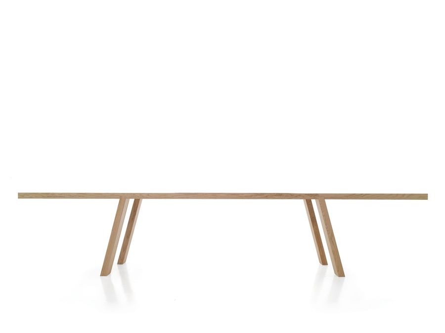 Столешница представляет собой единую горизонтальную балку, приподнятую на наклонных опорных основаниях и соединенную между собой. Доступен во всех вариантах отделки деревом Porro и в 8 размерах рассчитанный на 6, 8 или 10 посадочных мест, он идеально подходит для самых маленьких помещений, которые не хотят отказываться от линейной элегантности этого стола от Пьеро Лиссони.
