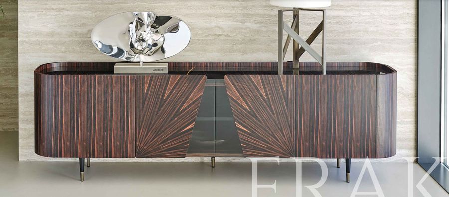 Конструкция из черного дерева или обитая кожей, дверцы, обитые кожей, столешница из мрамора и стеклянные детали на дверцах.