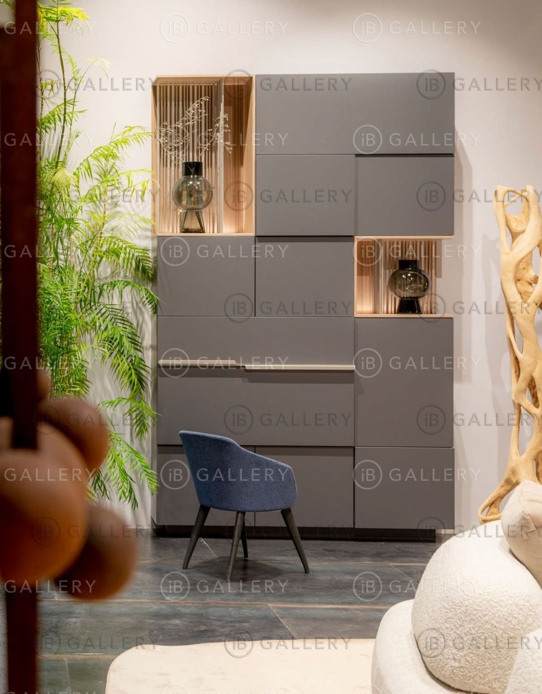 Модель включает в себя несколько закрытых ящиков и две открытых полки с подсветкой. Она створка открывается и превращается в небольшой рабочий стол. Также оснащен подсветкой.