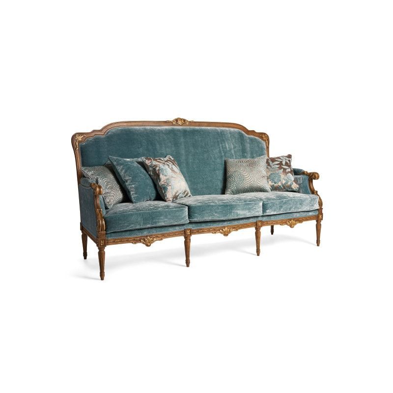 Каркас выполнен из дерева, украшенный резьбой и позолотой. Обивка представлена в ткани.