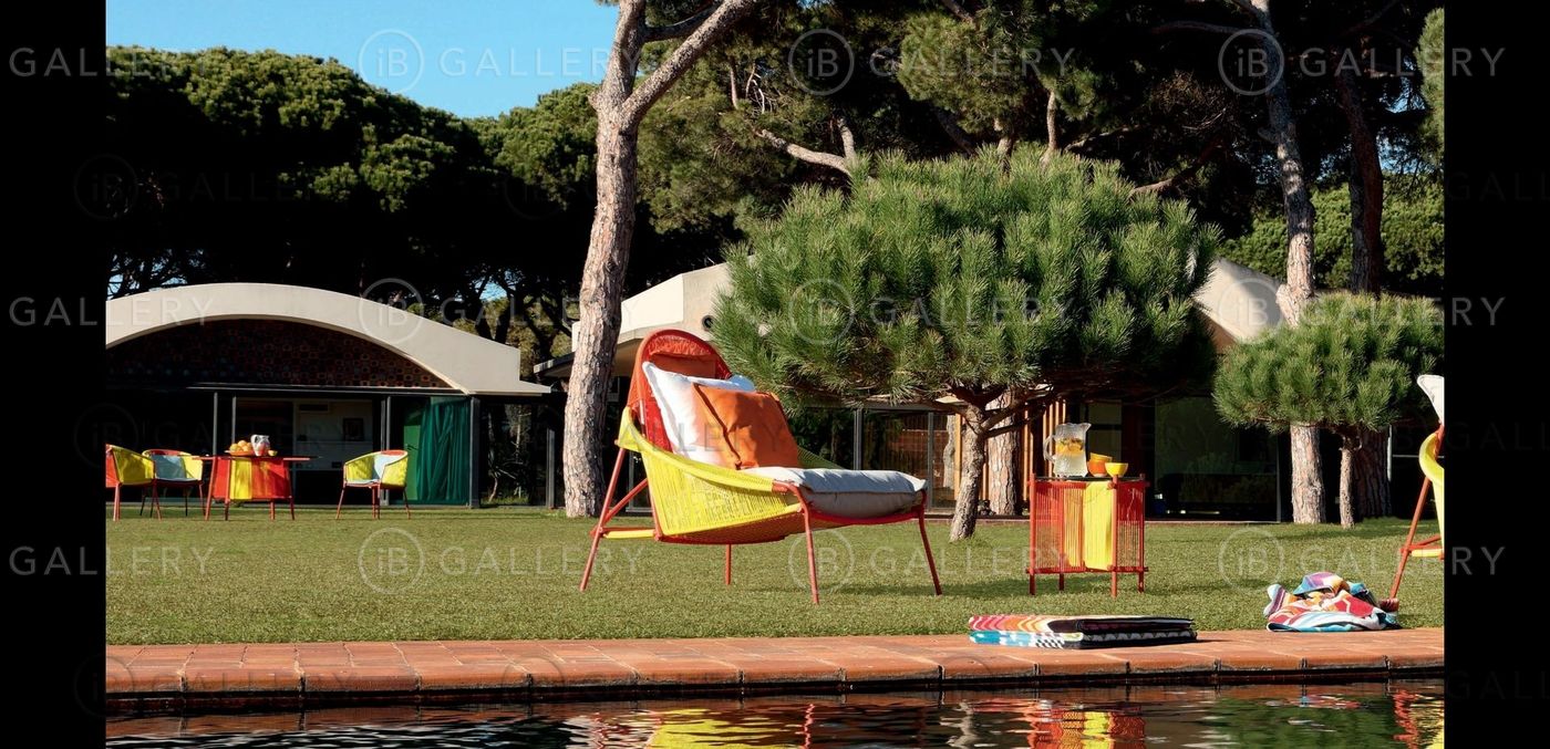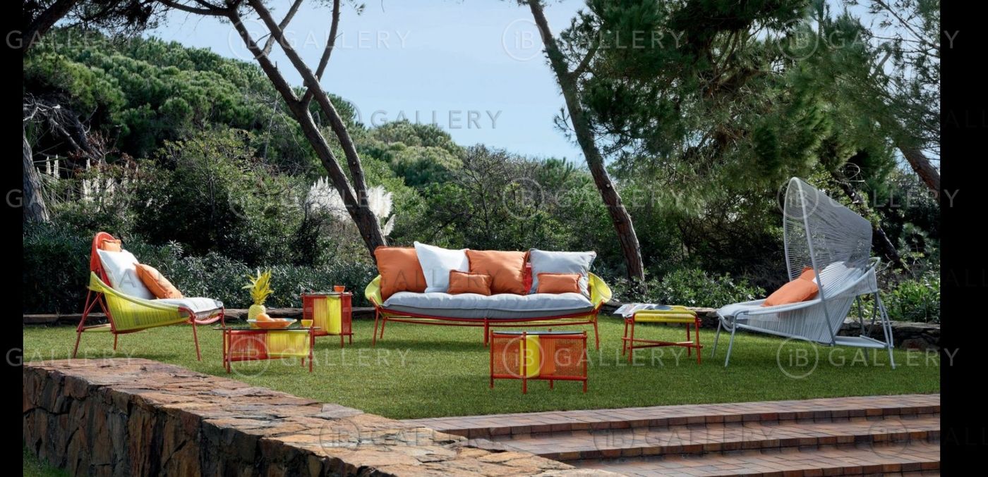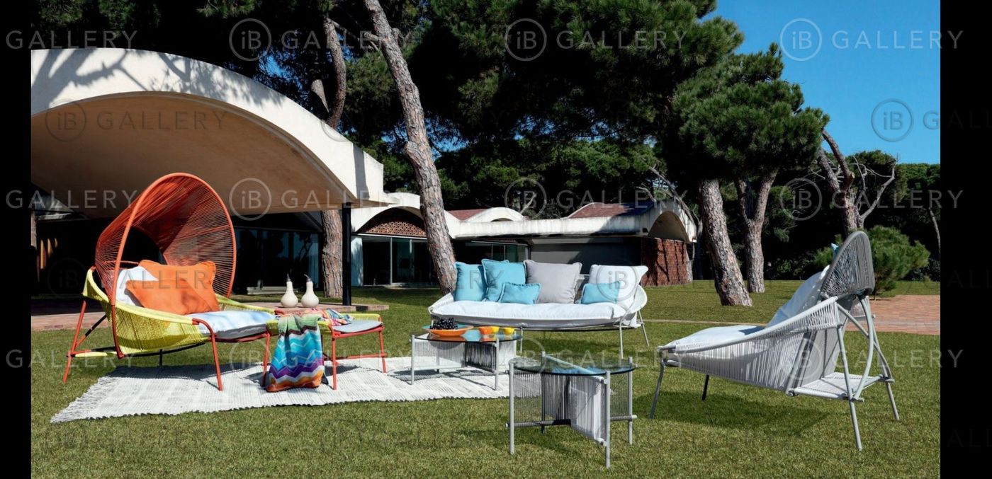 Широкое кресло с плетеной спинкой, которое украсит любое пространство. Его отличительной чертой являются тонкие трубчатые конструкции из лакированного алюминия с плетеными цветными шнурами в трех цветовых сочетаниях: ярких (коралловый, красный и желтый), спокойных (серый, белый и кобальтово-синий) и натуральных (похожий на веревку шнур мышино-серого, бежевого и кирпичного цветов).