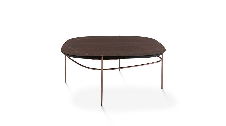 Он оснащен конструкцией из цветной хромированной стали (доступно 4 цвета) и столешницей из дуба, окрашенного в каштановый цвет, с инкрустированной резьбой на поверхности основания.