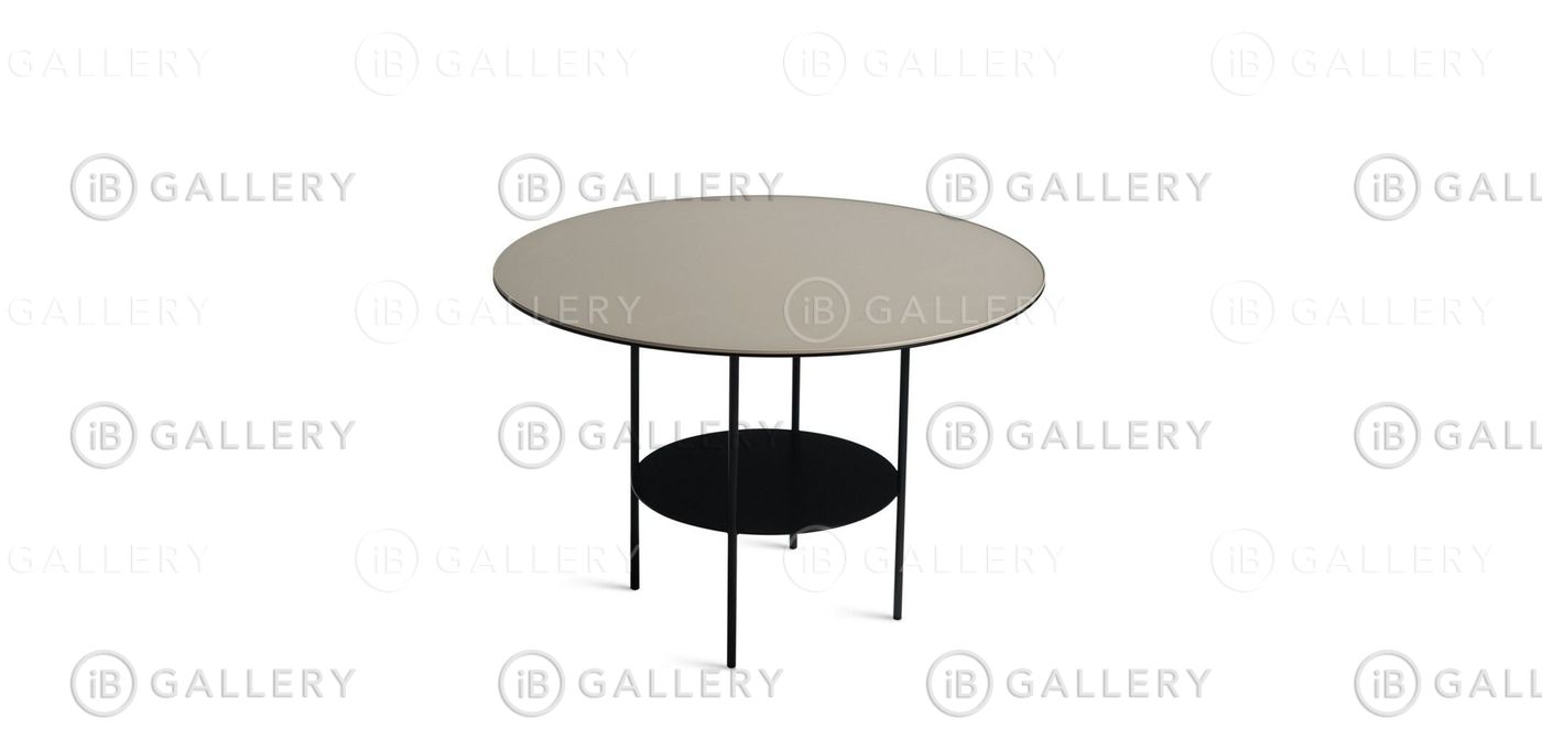 Их столешницы могут быть разнообразно декорированы. Круглый столик для коктейлей с верхним подносом (возможны различные варианты отделки), нижним подносом и ножками из черной лакированной стали.