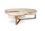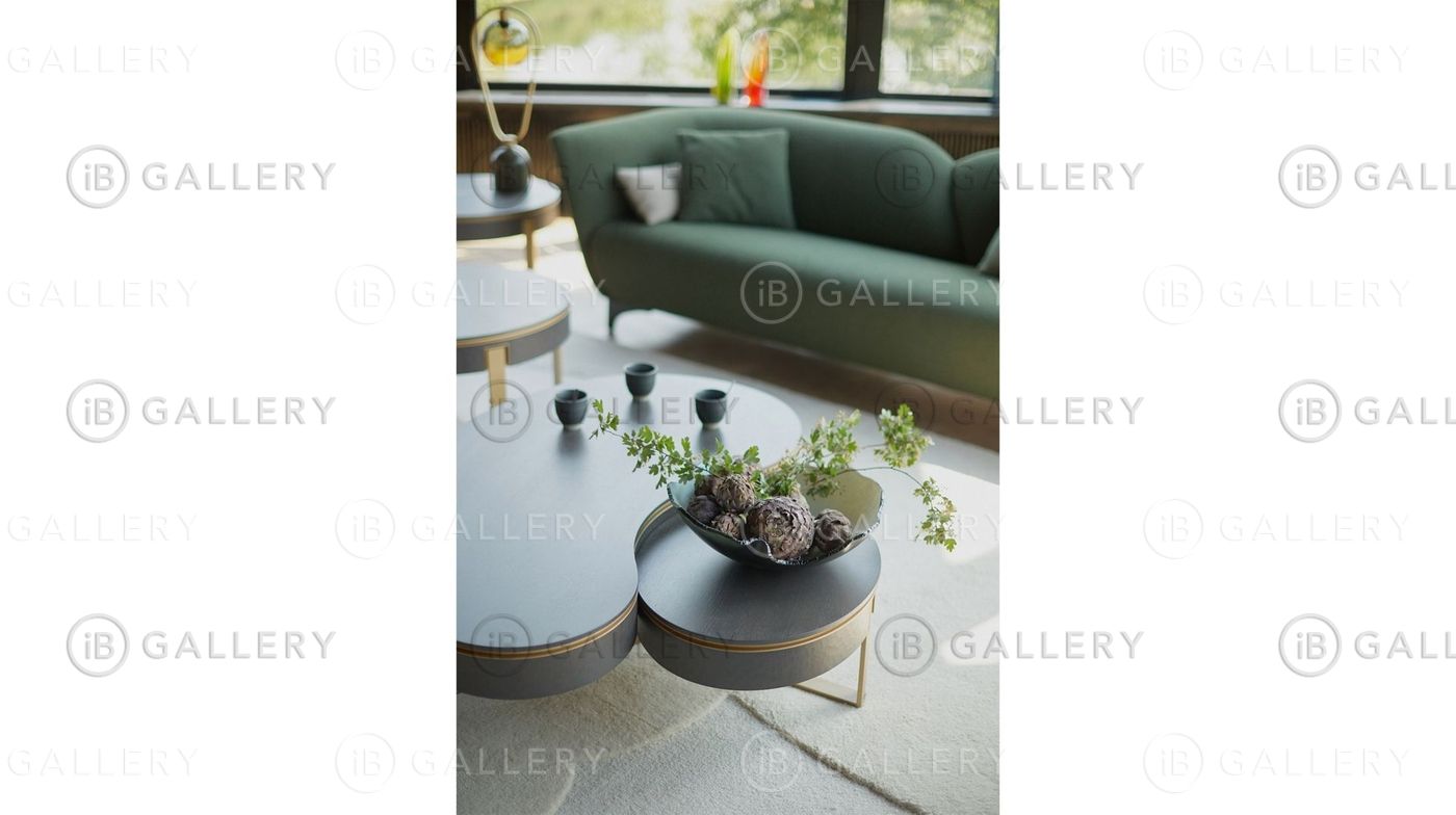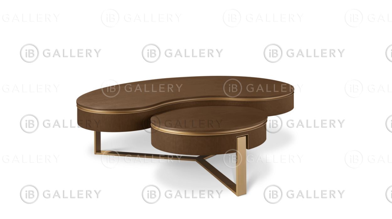 Пояс из мореного дубового шпона на фанере и МДФ, столешница из мореного дубового шпона на МДФ, окружающая кромка и ножки из МДФ с покрытием латунным лаком, металлическая конструкция из латуни с покрытием лаком.