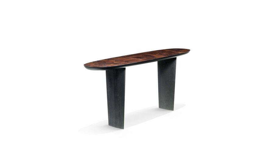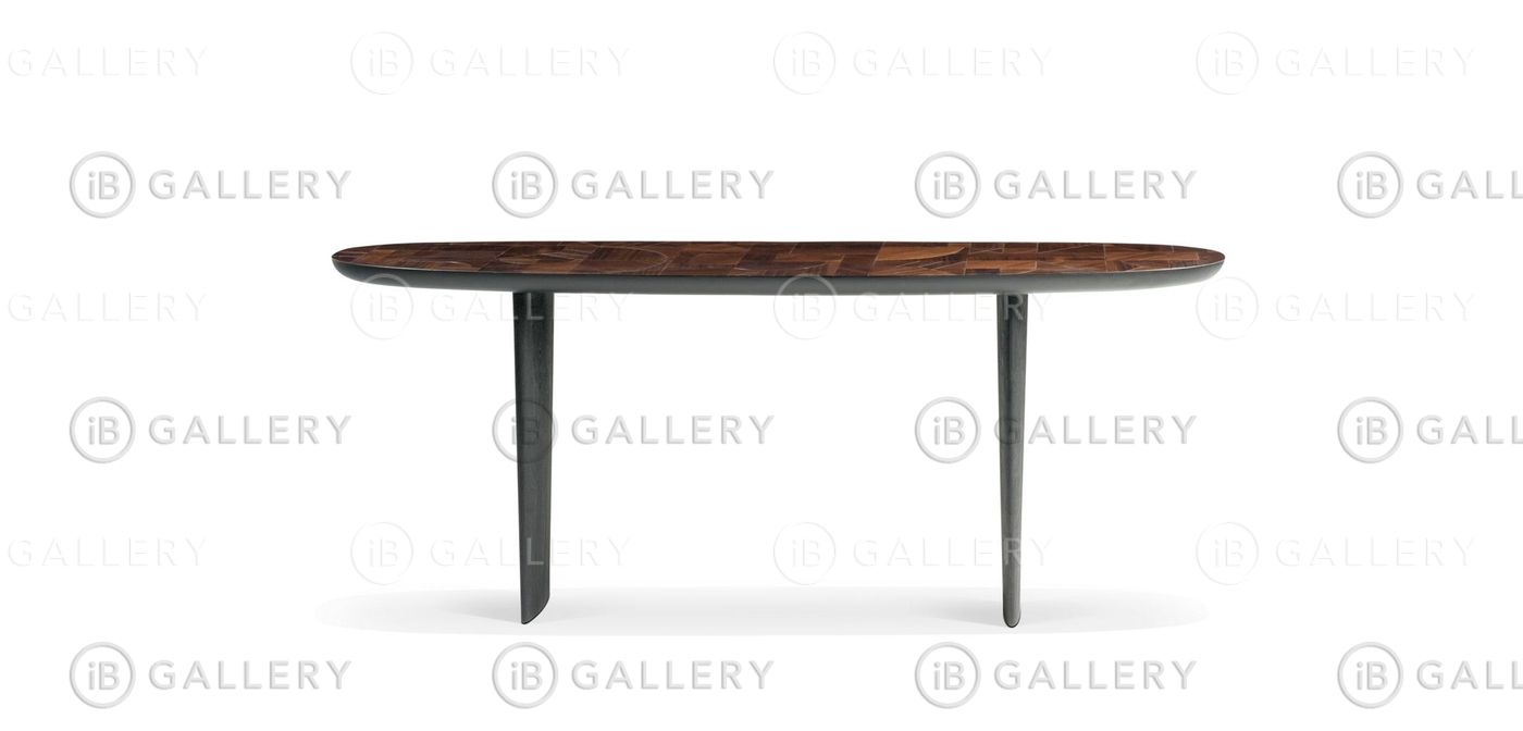 Столешница с инкрустацией из кусочков орехового дерева, разделена полым швом (доступно несколько цветов) из МДФ. Ножки из цельного куска липы без волокон, окрашенные углеродом.