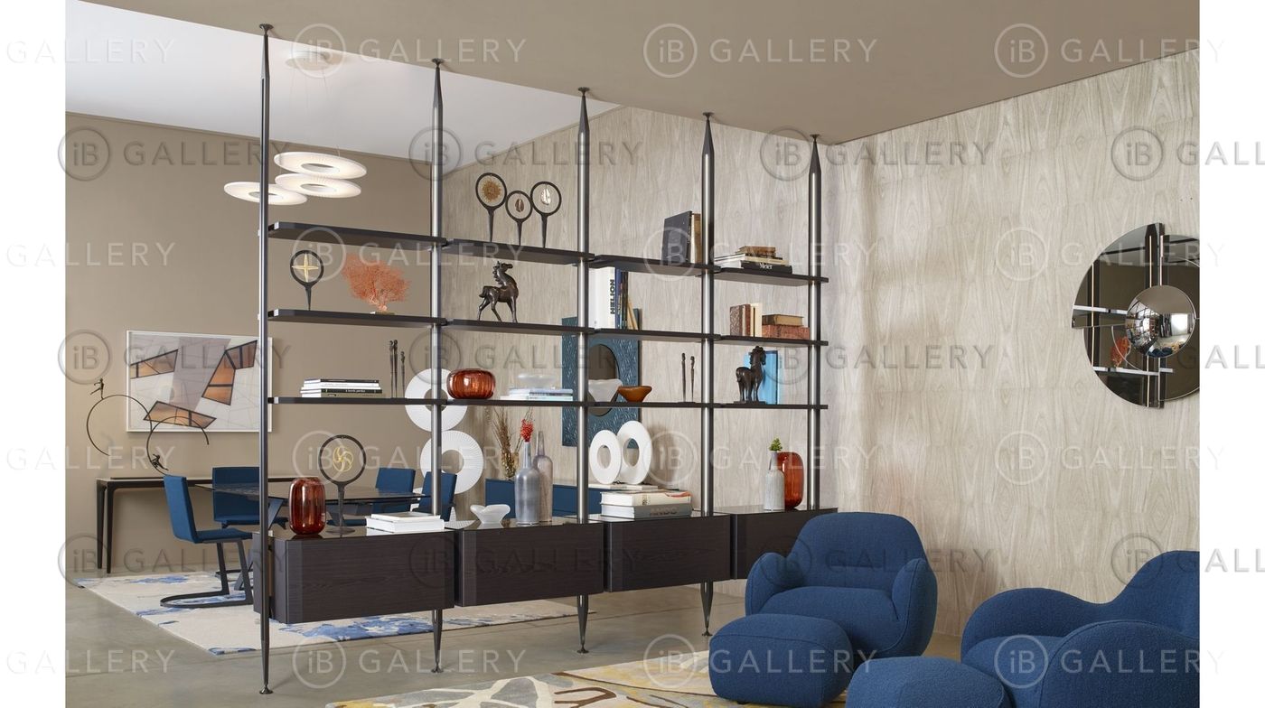 Стеллажи для хранения из шпона Alpi с витражным или лакированным покрытием на древесностружечной плите; опционально столешница из лакированного стекла. Полки покрыты лаком или шпоном Alpi®, а также дымчатым закаленным стеклом толщиной 12 мм.