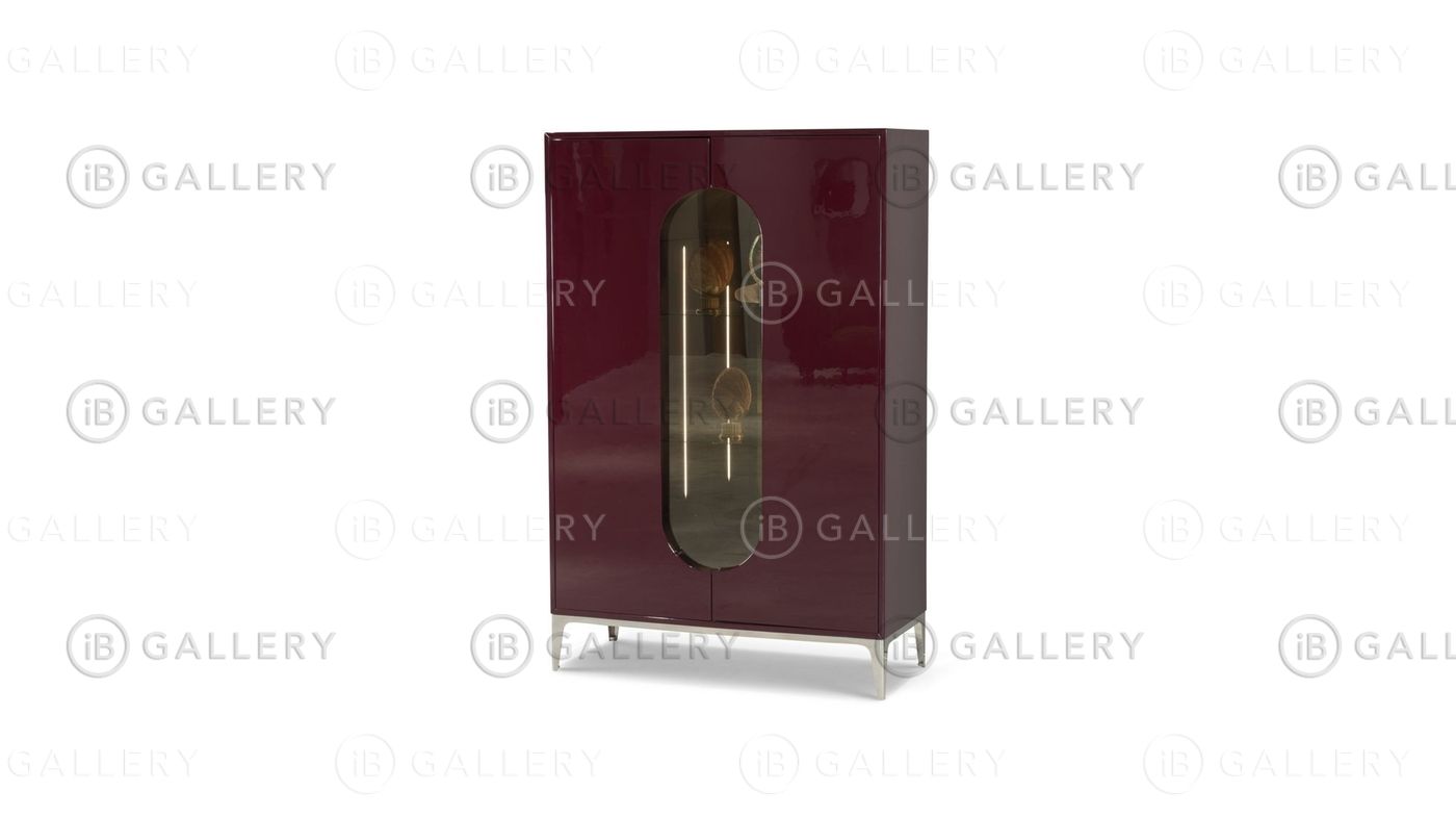 Шкаф с 2 дверцами из панелей МДФ. Снаружи покрыт глянцевым лаком, внутри - эксклюзивным матовым рисунком с печатью или эксклюзивным глянцевым рисунком с печатью. Внутри - светодиодная подсветка с датчиком и дистанционным управлением. Основание из полированной нержавеющей стали.