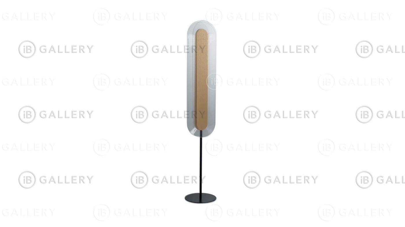 Торшер со стальной конструкцией, покрытой черным матовым лаком, двумя рассеивателями из метакрилата с выгравированными канавками и центральными магнитными элементами из металла, покрытыми золотым лаком.