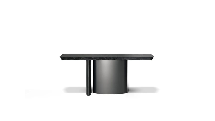 Едва заметный проем между изогнутыми модулями, формирующими основание, обеспечивает взаимодействие света, который освещает различные профили консольных колонн. Ножки расположены очень близко друг к другу, так что с некоторых точек зрения расстояние не воспринимается; это создает визуальную нестабильность и удивительный динамический эффект. В то же время игра ножек придает направление консоли, а значит, и пространству, в котором она используется.