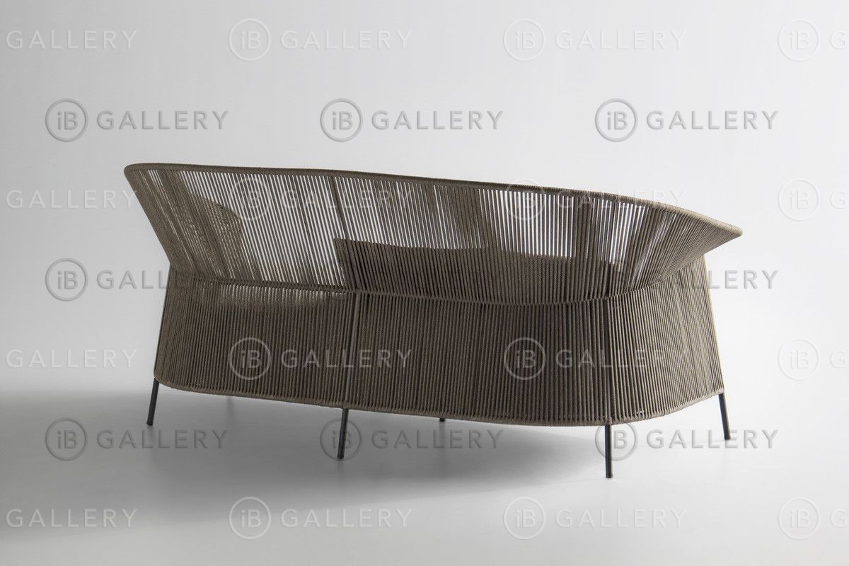 Спинка дивана выполнена из металлического каркаса, покрытого порошковым лаком, который вручную сплетен из ленты “Fly”.