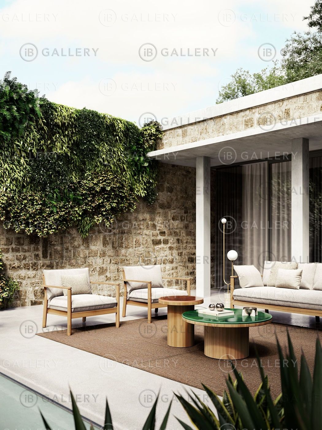 Диван и кресло изготовлены из натурального тика в сочетании с мягкими плюшевыми подушками, которые придают им современный и утонченный вид.