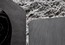 Столешница неправильной формы представляет собой интересное сочетание двух кусков гранита с переплетающимися гранями, напоминающими кусочки танграма: плита из гранита Nero Assoluto сочетается с листом серого гранита штата Вермонт. Текстурированная поверхность дополнена латунной вставкой с сатинированным покрытием в месте соединения.