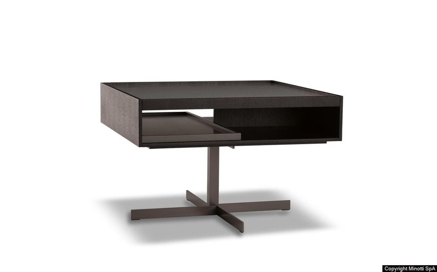 Простое металлическое основание завершается крестообразным напольным основанием из изысканной сатинированной бронзы. Верхняя часть имеет отделение со съемным лотком, доступ к которому возможен с обеих сторон, и поставляется в двух вариантах исполнения: корпус из лакированного дуба Мока с открытыми порами, глянцевая лакированная поверхность цвета глины с внутренним лотком, покрытым матовым глиняным лаком, или с рамой, покрытой матовым глиняным лаком, и верхним и внутренним лотком корпус выполнен из дуба с открытыми порами, покрытыми лаком Moka.