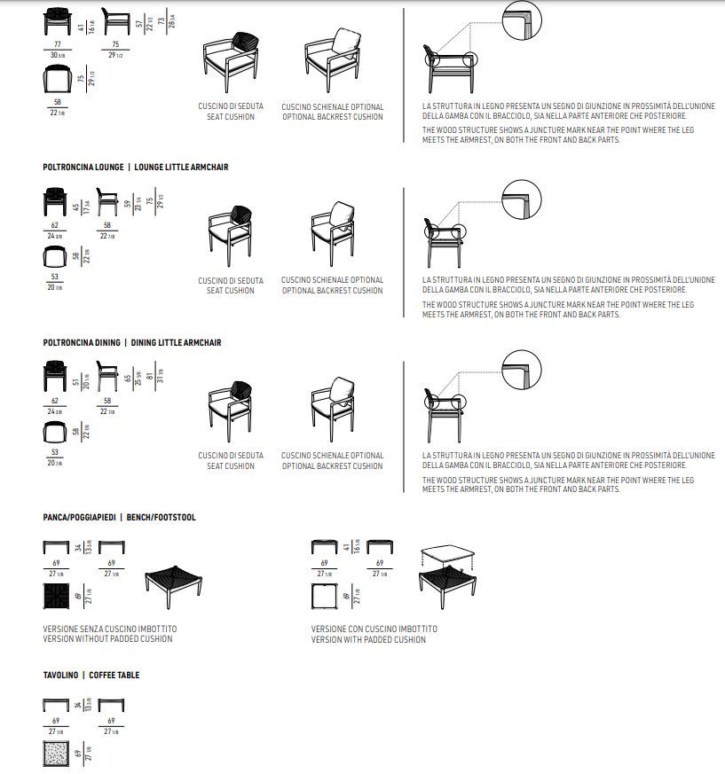 Сиденье и верхняя часть скамеечки для ног выполнены из сбалансированного переплетения нитей, которое придает естественное очарование ручной работы в соответствии с классическими принципами нанизывания; для лучшего крепления подушек к сиденью и спинке в сочетании с отделкой каркаса была применена специальная тиковая накладка.