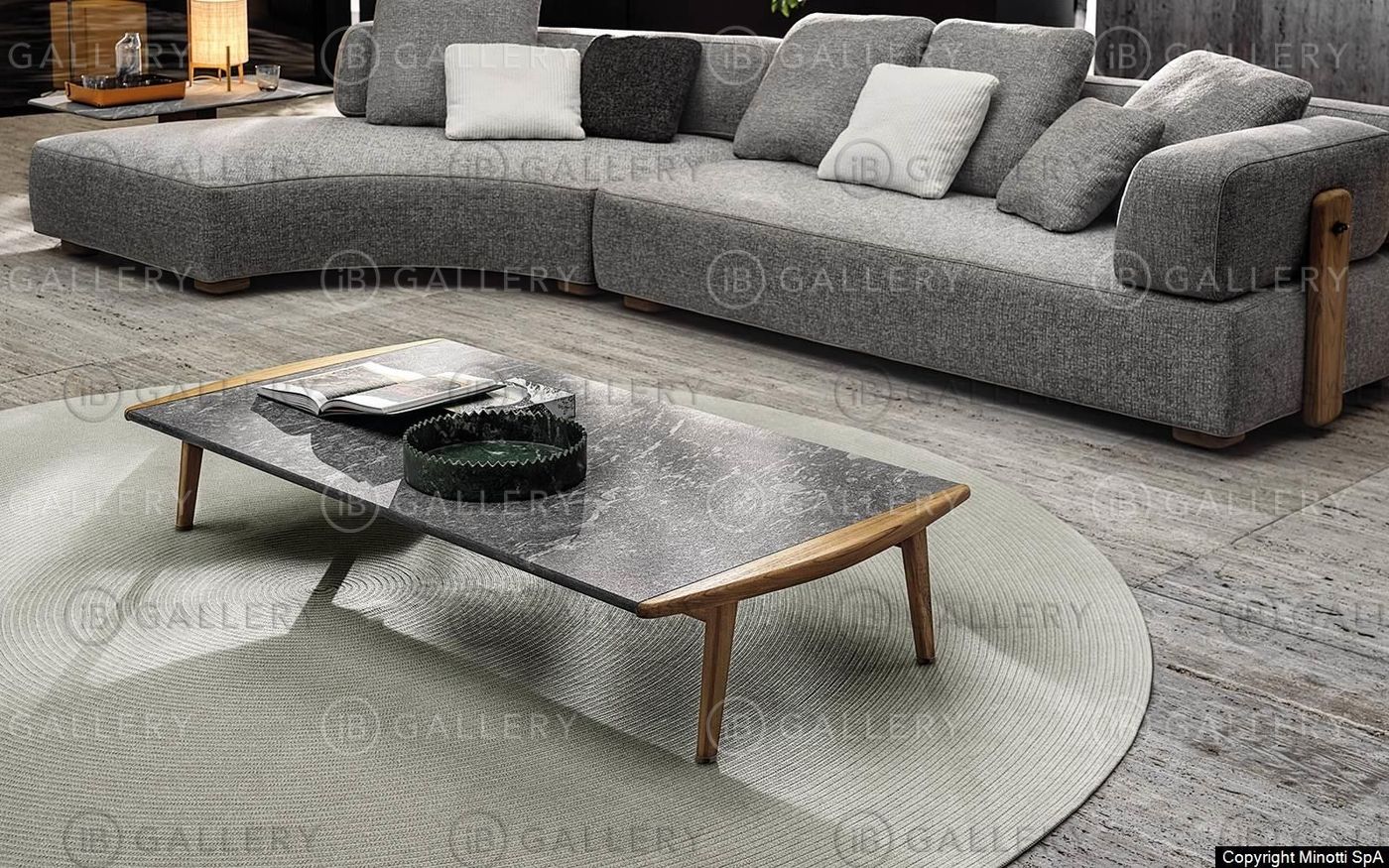 Журнальные столики также имеют ту же линию, что и деревянный подлокотник в стульях коллекции, который имеет небольшой изгиб, который также можно найти в закругленных сторонах столешницы. Центральная часть журнального столика подчеркнута столешницей Pietra del Cardoso, что создает изысканное сочетание материалов.