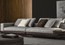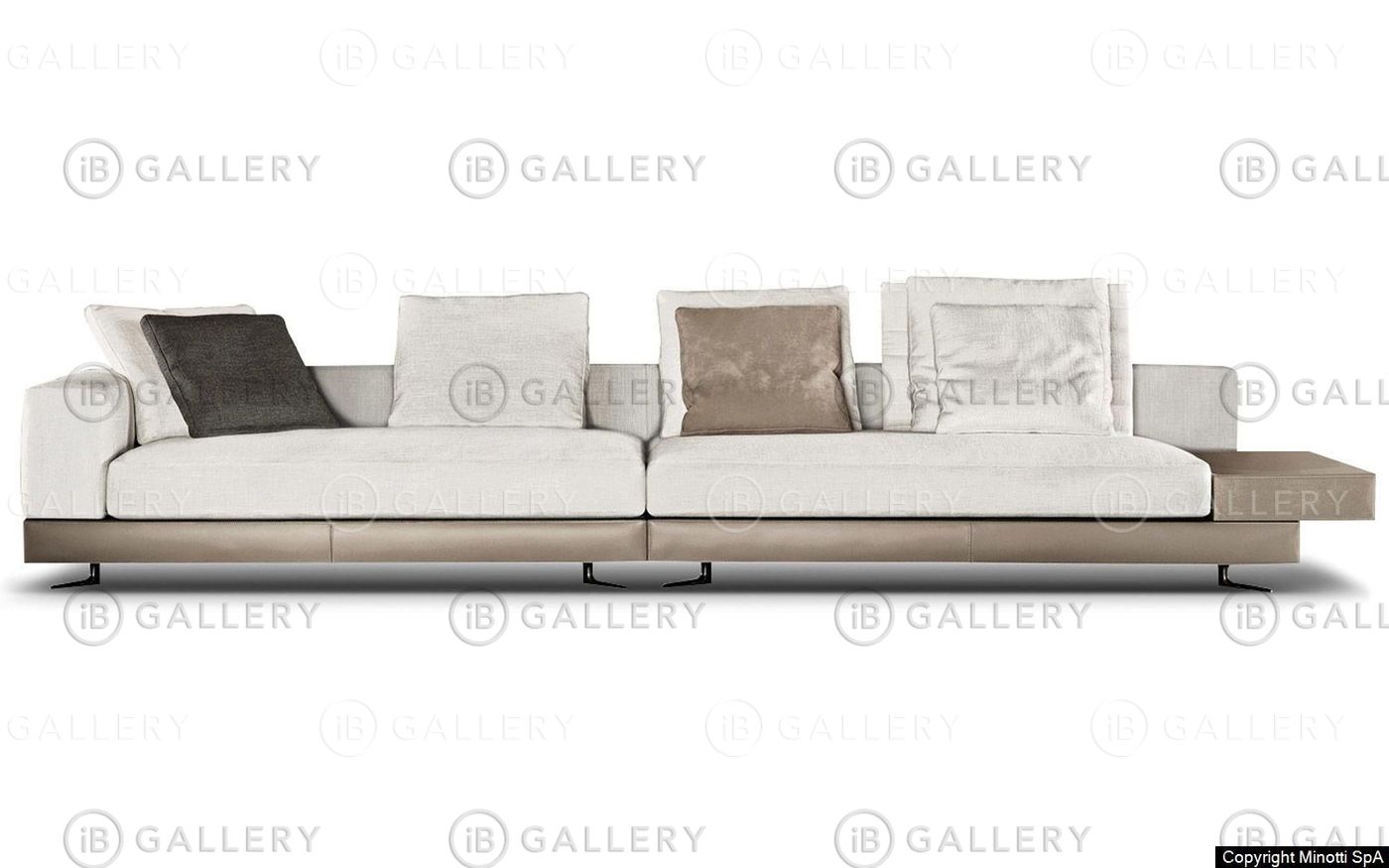 Основание дивана может быть обито тканью, кожей или кожзаменителем, на которые укладываются спинки сидений, подушки и столешницы для подносов, создавая увлекательную игру форм и чередуя положительные и отрицательные стороны пространства. Диван установлен на ножках из литого под давлением алюминия оловянного цвета, эксклюзивного дизайна студии Minotti, которые установлены под углом 45° к углам дивана, что придает дополнительную изюминку даже композициям большего размера. Чтобы сделать белый диван еще более уютным, обивка подушек была дополнена более глубоким слоем гусиного пуха, что сделало их роскошно мягкими и создало приятный контраст с элегантной формальностью основания дивана.