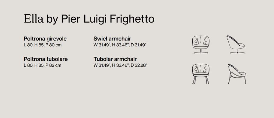 Сиденье и спинка созданы из единого мягкого объема, который раскрывается, обеспечивая комфортную и удобную поддержку. Стальное трубчатое основание охватывает и поддерживает корпус, придавая креслу легкость и динамичность благодаря легким и изогнутым профилям. Эстетика дополняется такими тонкими деталями, как свободный изгиб спинки и грогрен, которая может быть подобрана в тон обивке или контрастировать с ней. Кресло Ella также доступно во вращающемся варианте с основанием на 4 ножках-спицах, и идеально подходит для коммерческих помещений.