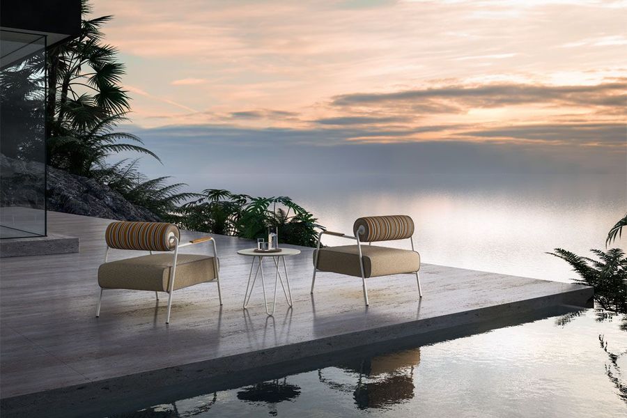 Его отличительными особенностями являются окантовка по краям полностью съемных тканевых чехлов и спинка с роликовой подушкой, которая в некоторых случаях может быть подвижной и устанавливаться по мере необходимости. При изготовлении уличной мебели используется полностью дренирующая, дышащая и устойчивая к атмосферным воздействиям полиуретановая обивка. Трубчатая рама из нержавеющей стали доступна с матовой отделкой или в цветах эспрессо и морской волны. В соответствии с принципами экономики замкнутого цикла и устойчивого развития все предметы коллекции можно легко демонтировать.