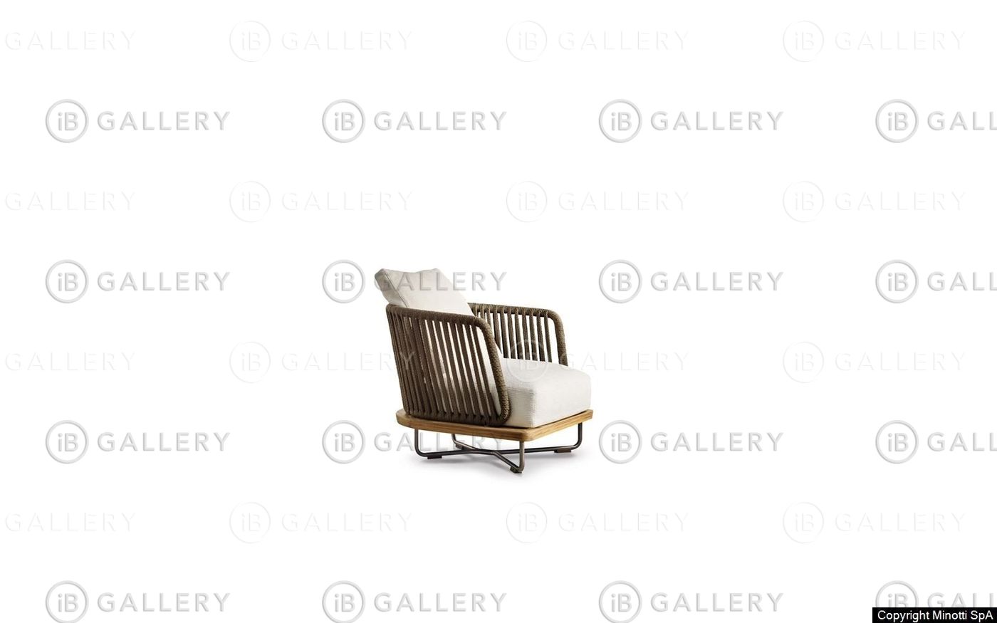 В нем сочетаются различные формы и материалы: воздушная поверхность из натурального тикового дерева определяет его горизонтальную линию, а изогнутая спинка с переплетенными шнурами придает ему динамичность.