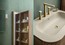 - Гарнитур для ванной комнаты, состоящий из деревянного шкафа со встроенной раковиной, зеркала и бра.