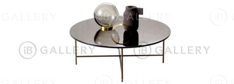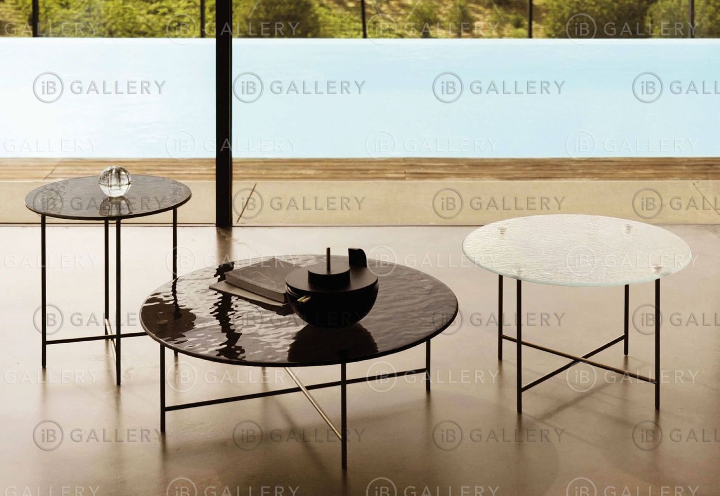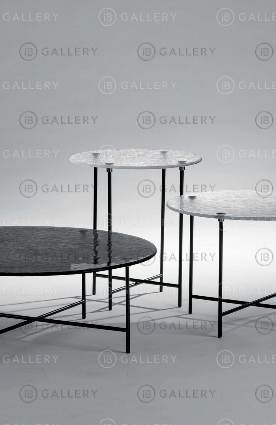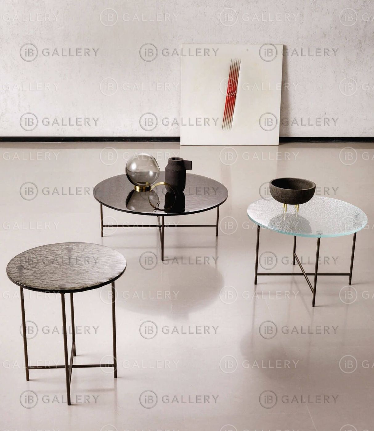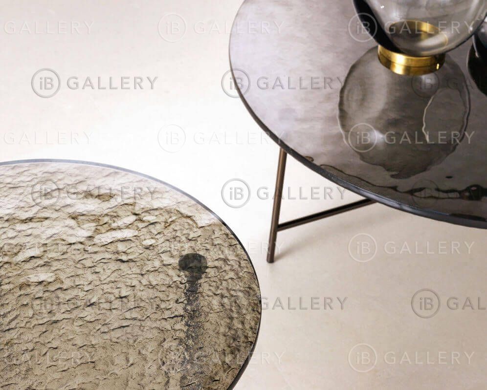 Столешница из текстурированного стекла с неровной поверхностью на обратной стороне, полученная в результате литья расплавленного стекла, создает эффект ручной работы, типичный для художественных творений, изготовленных в стекловаренных печах Мурано. Основание сделано из металла.