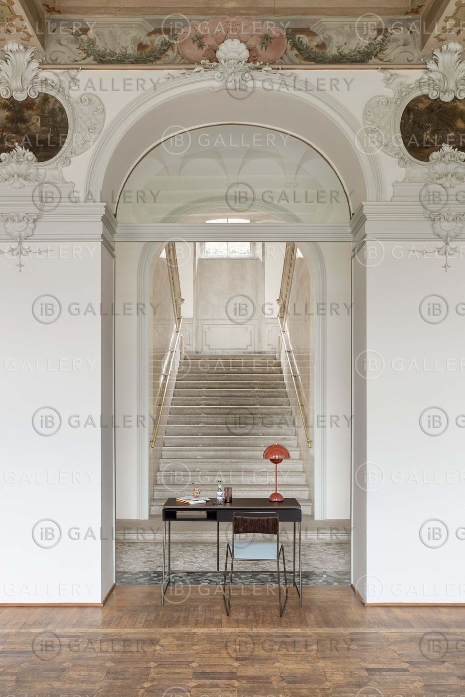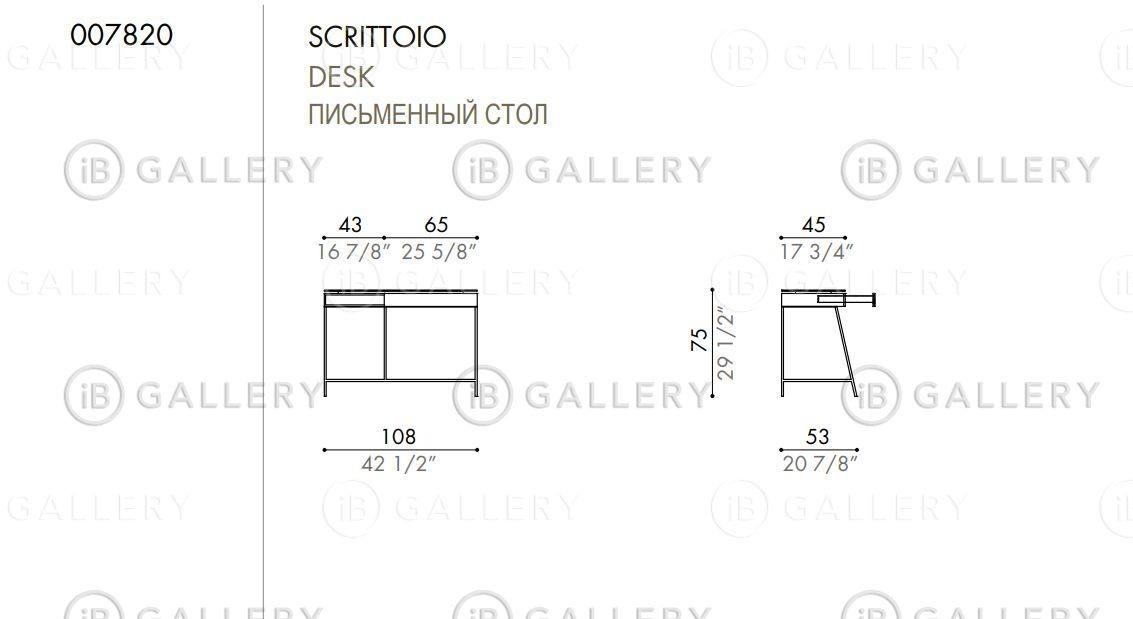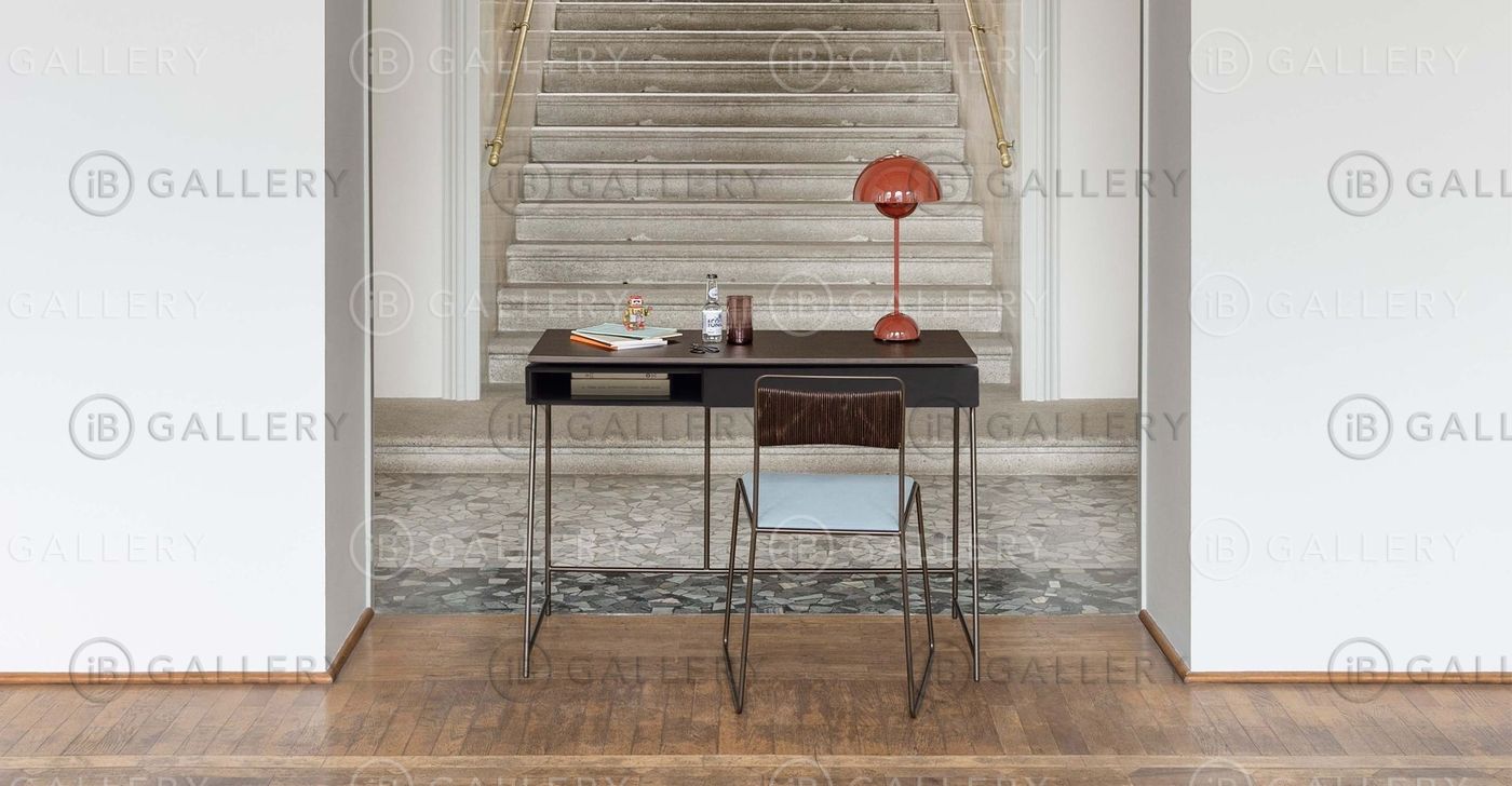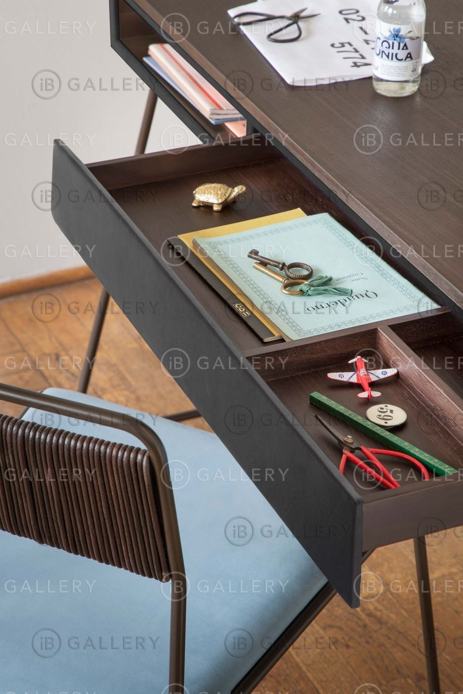 Металлическая конструкция создает асимметричные, но сбалансированные геометрические формы и поддерживает столешницу и корпус, изготовленные из ценных материалов, таких как дерево и кожа. Корпус состоит из открытого отделения и выдвижного ящика с кожаной передней панелью.